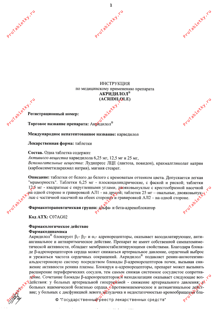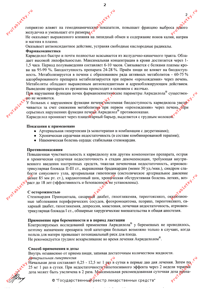 Неселективные бета-адреноблокаторы могут провоцировать появление болей у больных со стенокардией Принцметала. Опыта назначения препарата Акридилол® этим пациентам нет. Хотя его альфа-адреноблокирующие свойства могут предотвратить подобную симптоматику, назначать карведилол в таких случаях следует с осторожностью.