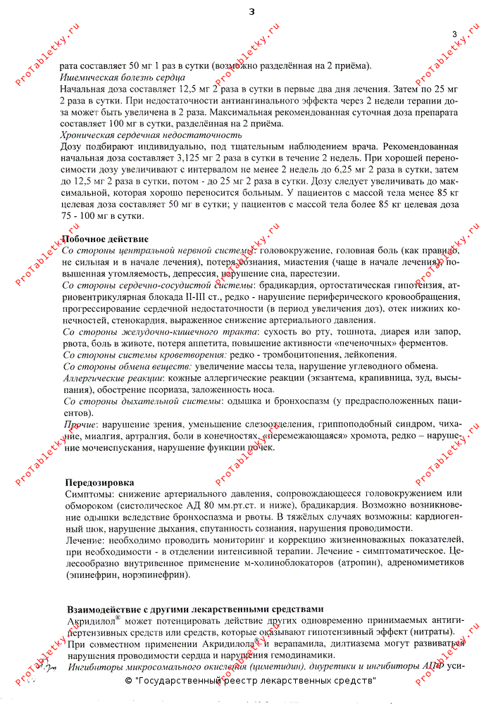 Акридилол® может вызывать брадикардию, при урежении ЧСС менее 55 уд./мин дозу препарата следует снизить.