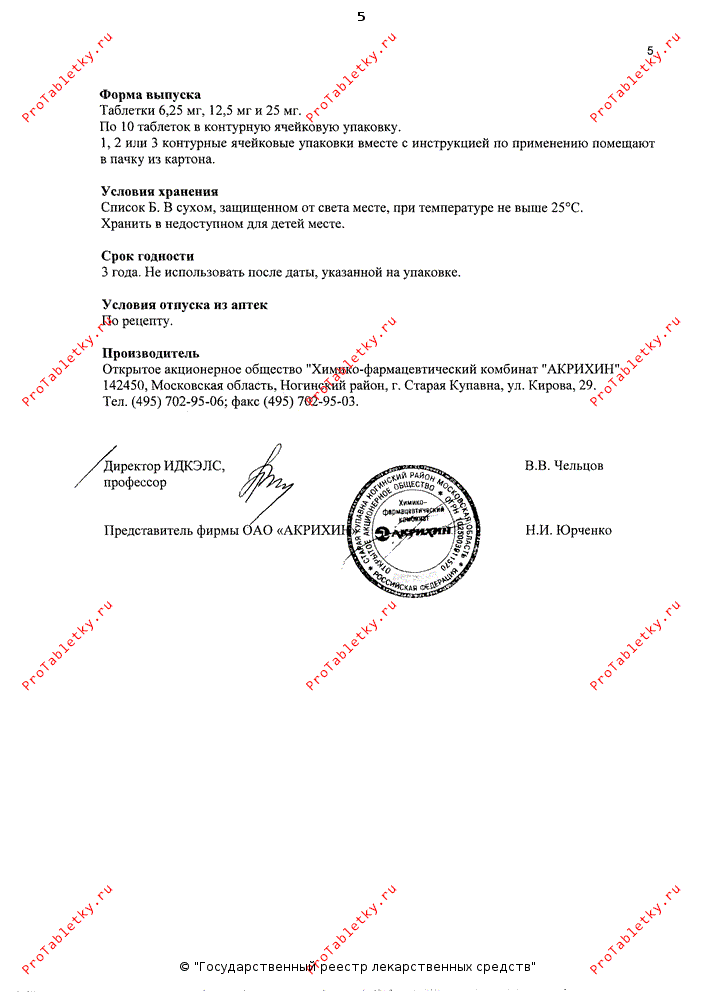 Рекомендованная начальная доза составляет 12.5 мг 2 раза/сут в первые 2 дня, затем по 25 мг 2 раза/сут. При необходимости впоследствии дозу можно увеличивать с интервалами не менее 2 недель, доводя до высшей суточной дозы, равной 100 мг, разделенной на 2 приема.