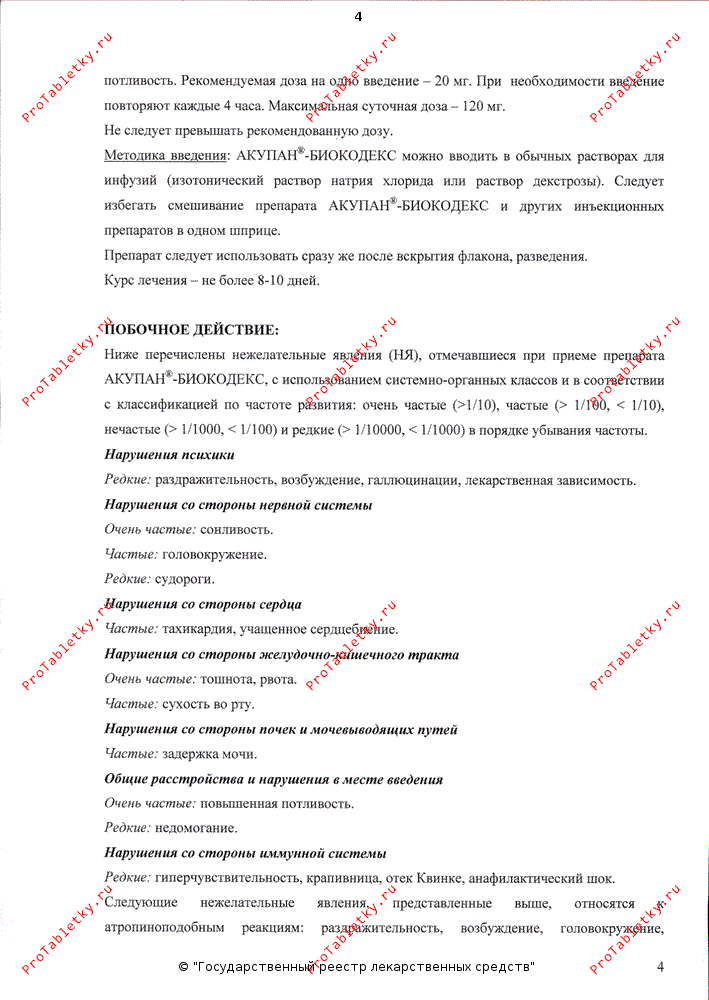 В/в введение: АКУПАН®-БИОКОДЕКС следует вводить в виде в/в инфузии длительностью не менее 15 мин, пациент должен находиться в положении лежа. Рекомендуемая доза на одно введение - 20 мг. При необходимости введение повторяют каждые 4 ч. Максимальная суточная доза - 120 мг.