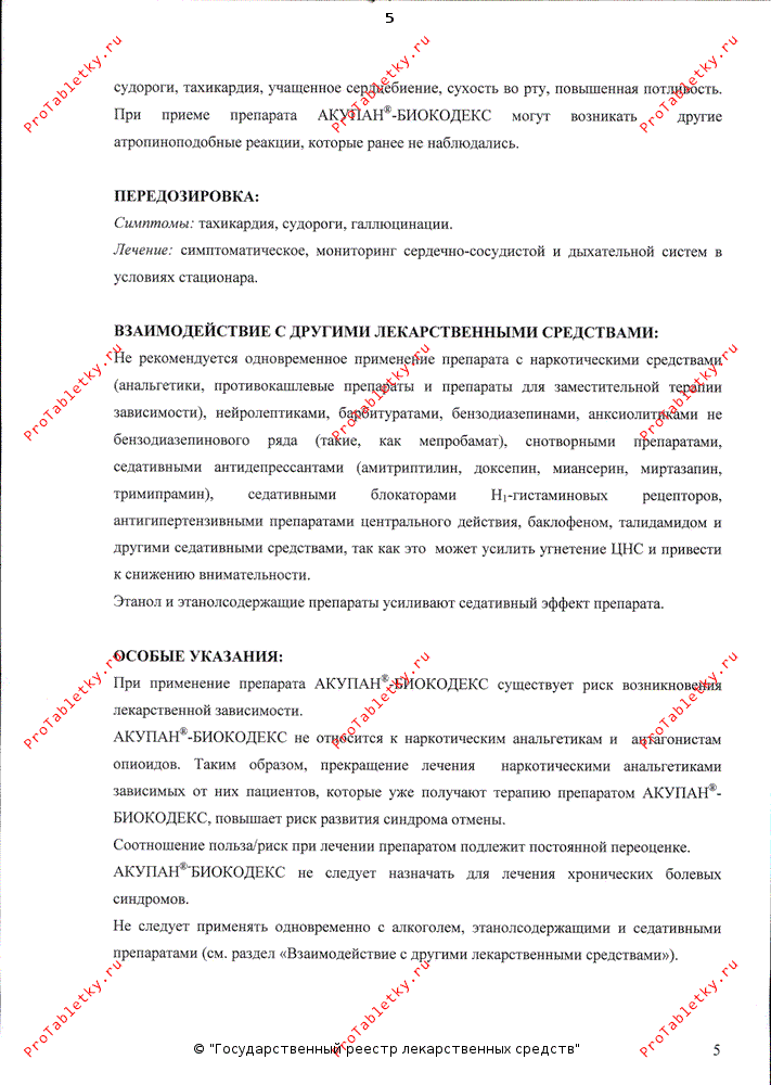 АКУПАН®-БИОКОДЕКС не относится к наркотическим анальгетикам и антагонистам опиоидов. Таким образом, прекращение лечения наркотическими анальгетиками зависимых от них пациентов, которые уже получают терапию препаратом АКУПАН®-БИОКОДЕКС, повышает риск развития синдрома отмены. Более того, АКУПАН®-БИОКОДЕКС не повышает дезинтоксикации пациента.