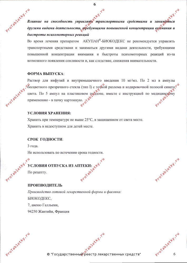 Методика введения: АКУПАН®-БИОКОДЕКС можно вводить в обычном растворе для инфузий (0.9% раствор натрия хлорида или 5% раствора декстрозы). Оптимальное соотношение при разведении - содержимое 1-ой ампулы препарата в 50 мл раствора для инфузий. Курс лечения - не более 8-10 дней.