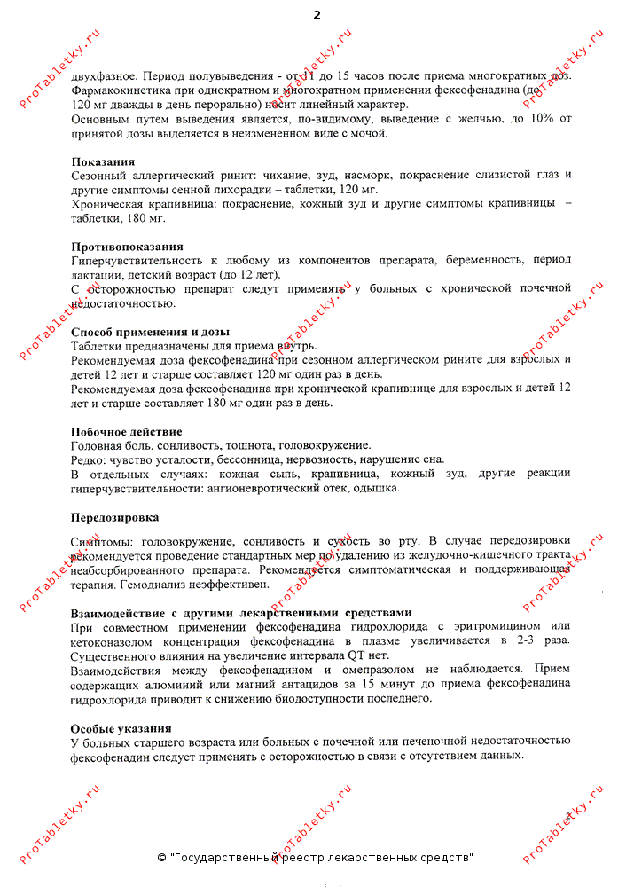 Также не наблюдалось изменений QTc при приеме фексофенадина здоровыми добровольцами по 60 мг 2 раза/сут в течение 6 месяцев, по 400 мг 2 раза/сут в течение 6.5 дней и 240 мг/сут в течение 1 года по сравнению с продолжительностью QTc при приеме плацебо.