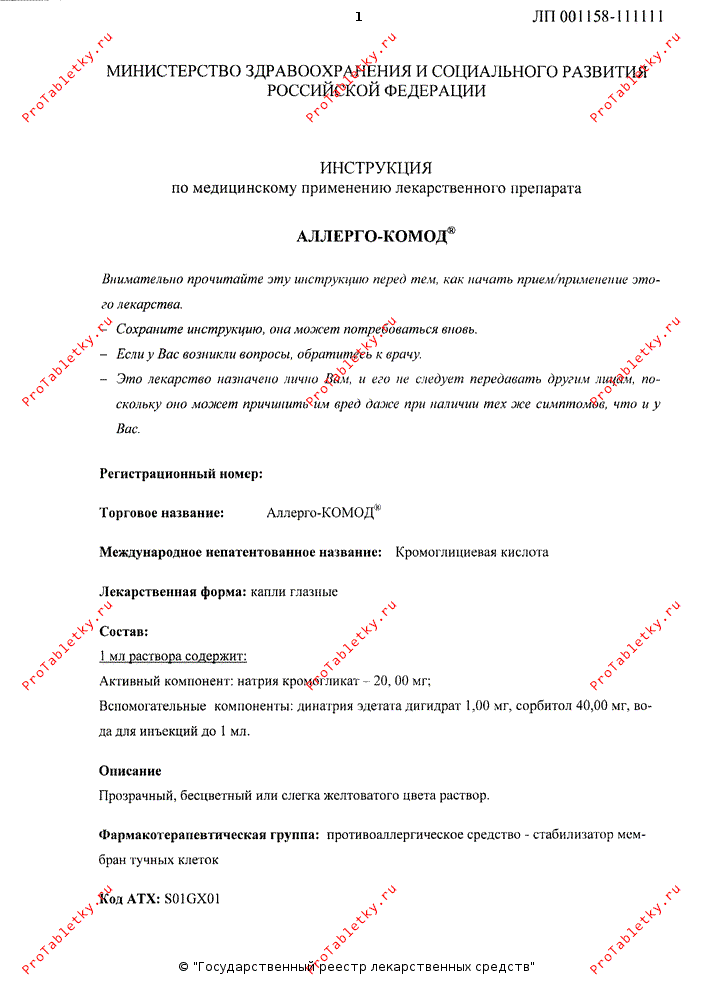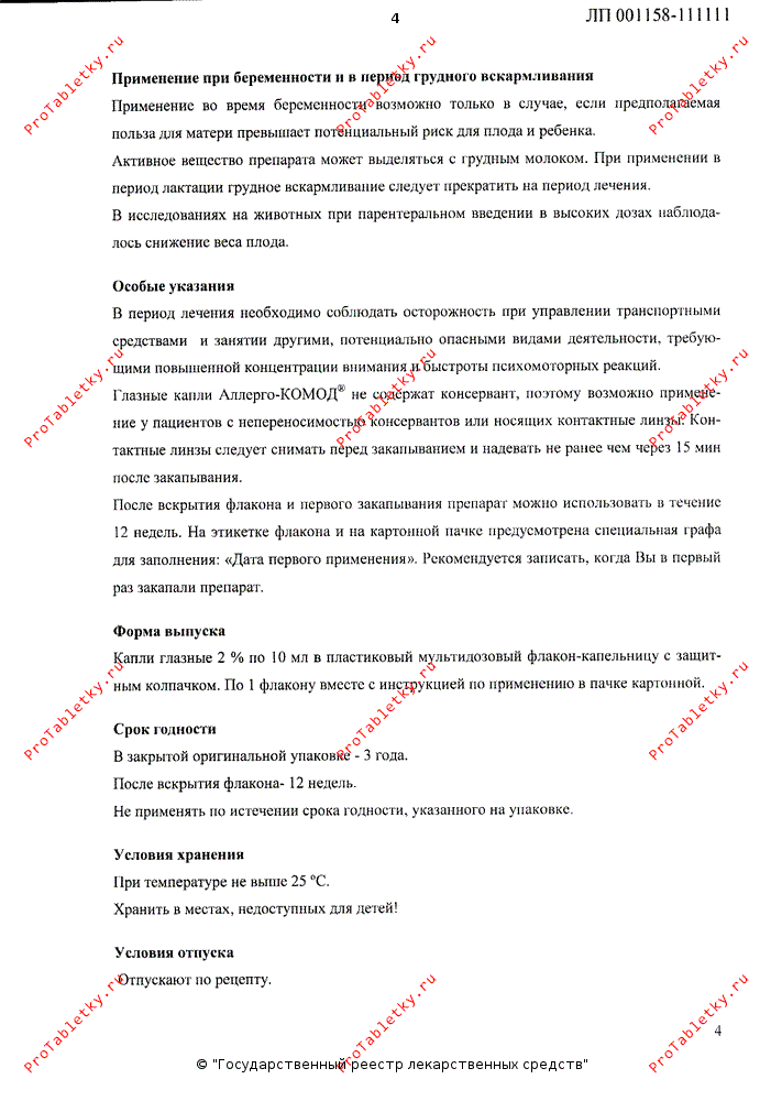 Глазные капли Аллерго-Комод не содержат консервант, поэтому возможно применение у пациентов с непереносимостью консервантов или носящих контактные линзы. Контактные линзы следует снимать перед закапыванием и надевать не ранее чем через 15 мин после закапывания.