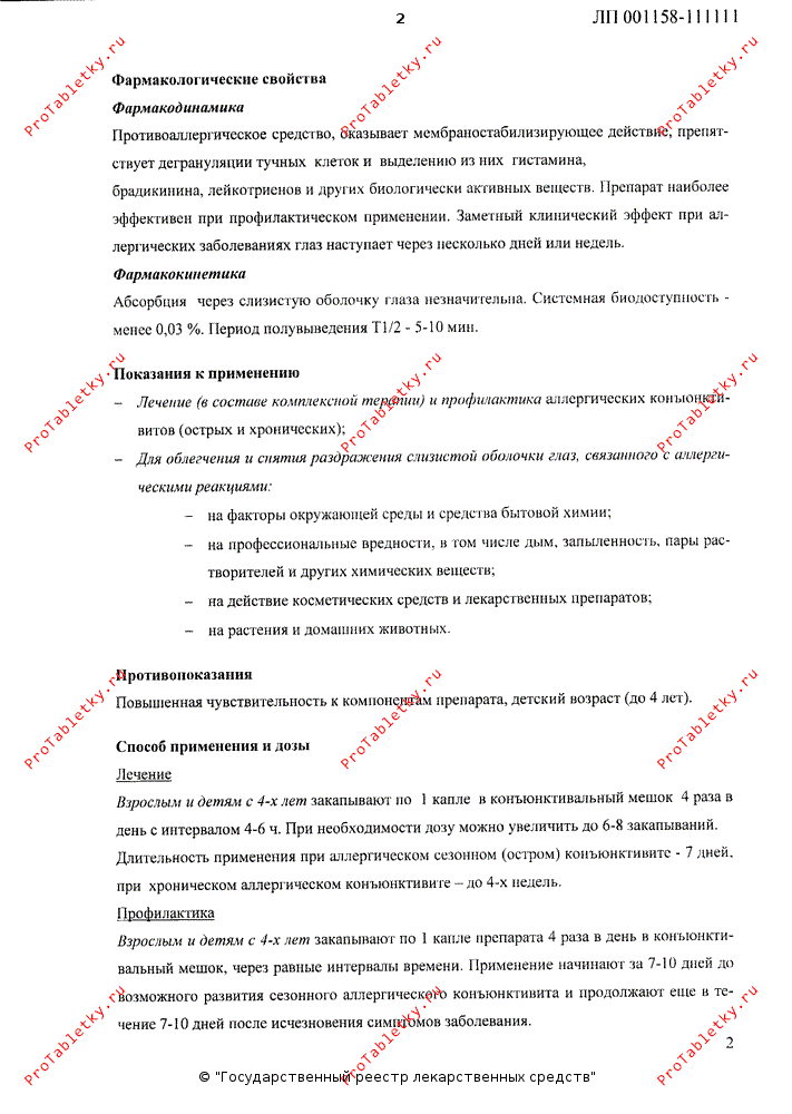 Взрослым и детям с 4-х лет закапывают но 1 капле в конъюнктивальный мешок 4 раза в день с интервалом 4-6 ч. При необходимости дозу можно увеличить до 6-8 закапываний. Длительность применения при аллергическом сезонном (остром) конъюнктивите - 7 дней, при хроническом аллергическом конъюнктивите - до 4-х недель.