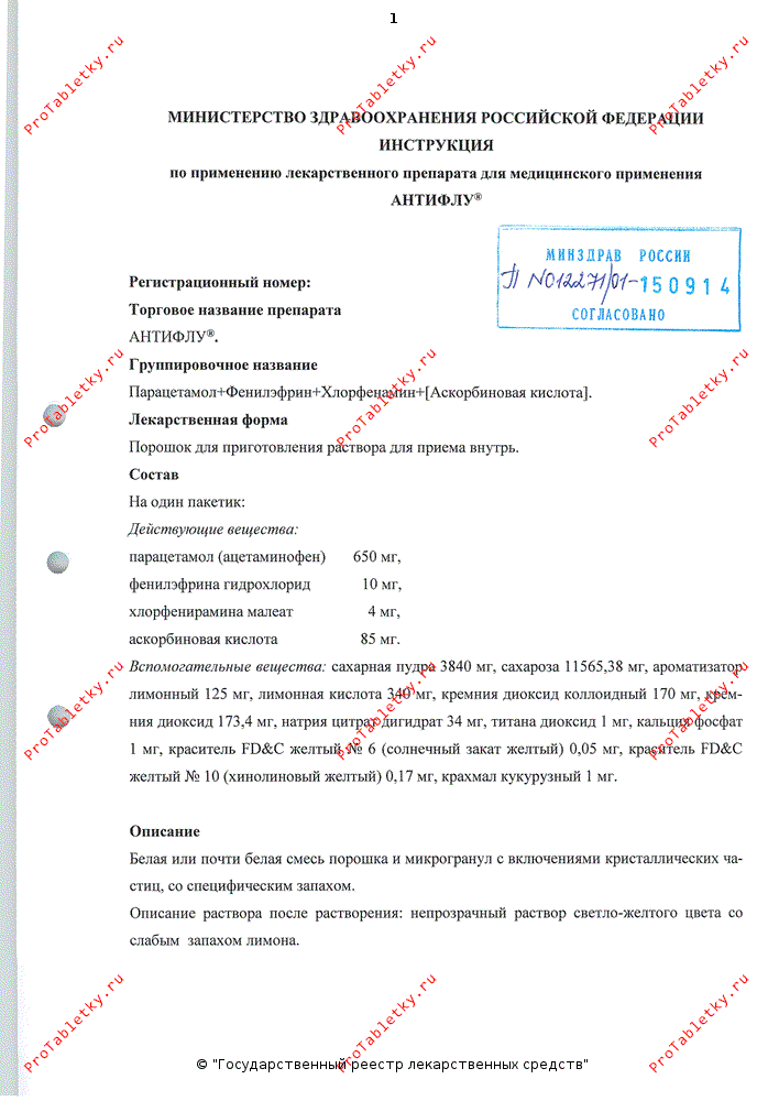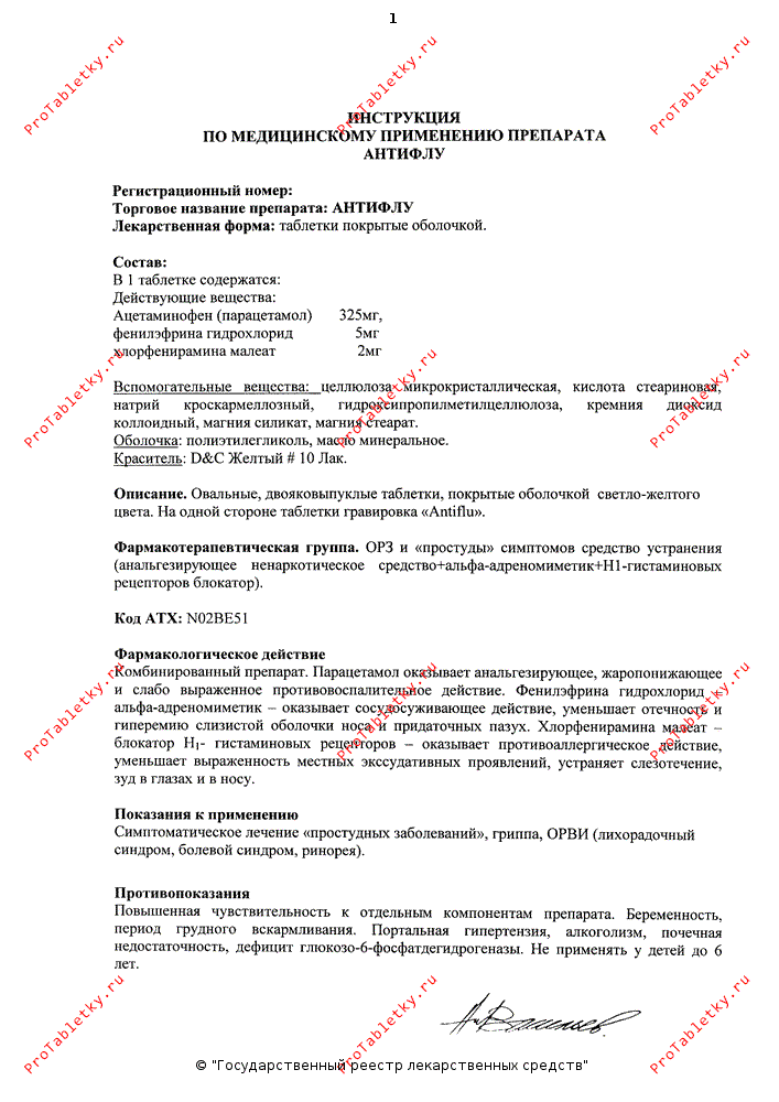 АнтиФлу (парацетамол + фенилэфрина гидрохлорид + хлорфенамина малеат) — комбинированное лекарственное средство для симптоматического лечения острых респираторных вирусных инфекций (ОРВИ), где слово «симптоматическое» означает, что препарат воздействует не на причину заболевания, а на ее следствие. Причем последнее говорится абсолютно не в упрек антиФлу. Дело в том, что ОРВИ могут вызываться множеством различных вирусов, к которым «за компанию» нередко присоединяются и всевозможные патогенные бактерии. По этой причине установить конкретного возбудителя заболевания, чтобы точечно воздействовать на него, зачастую представляется невозможным, а если еще вспомнить, что препараты с доказанной противовирусной активностью можно пересчитать по пальцам одной руки, то становится очевидной вся бесперспективность патогенетического лечения в подавляющем большинстве случаев. Но — ближе к делу, то есть, к антиФлу. Как уже отмечалось выше, это комбинированный препарат, компоненты которого подобраны с учетом охвата всех малоприятных простудных симптомов. Парацетамол — оказывает обезболивающее, антипиретическое и слабое противовоспалительное действие. Принадлежащий к группе альфа-адреномиметиков фенилэфрина гидрохлорид обладает вазоконстрикторным действием, снимает отечность и устраняет гиперемию слизистой оболочки носовой полости и околоносовых пазух. Блокатор гистаминовых рецепторов подтипа Н1 хлорфенамина малеат эффективно купирует аллергическую симптоматику, смягчает локальные экссудативные проявления. Чтобы понять, что дает прием антиФлу, необходимо несколько подробнее рассмотреть особенности протекания ОРВИ. Эта группа заболеваний имеет как общие (повышение температуры тела, слабость, головные и мышечные боли), так и местные (першение и боль в горле, кашель, насморк, ринорея, чихание) симптомы. Главным симптомом в этой яркой картине, являющимся наипервейшей причиной обращения пациента к врачу, объективно считается лихорадка или повышение температуры тела до фебрильных значений.