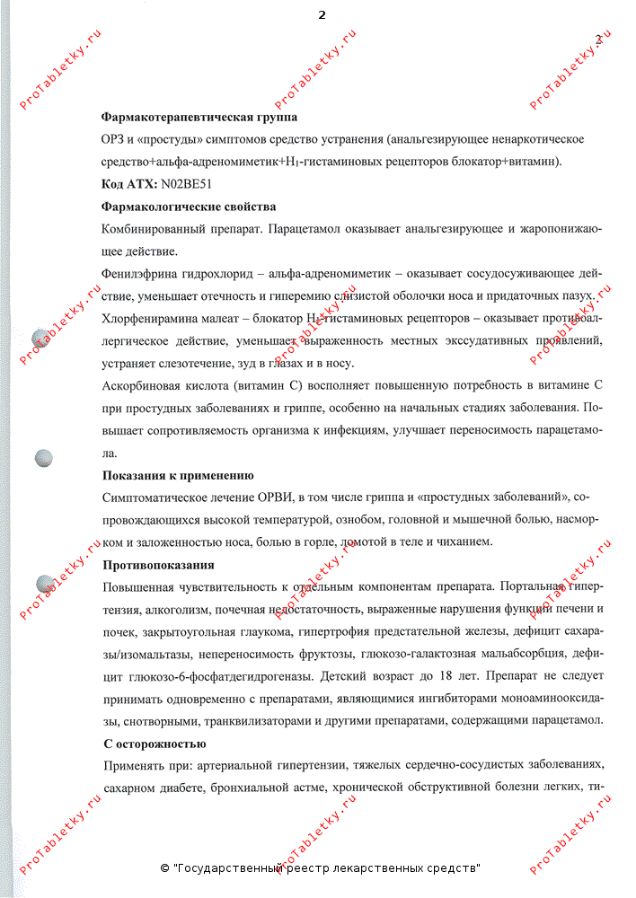 У своих пациентов назначал несколько раз данный препарат. Применять не люблю, но регулярно наблюдаю результаты самолечения и назначений коллегами. Одна из модных сейчас комбинаций НПВС, адреномиметика и антигистаминного средства, дающих в комплексе волшебный симптоматический эффект подавления всех основных симптомов острого периода гриппа и ОРЗ. Действует быстро и выражено. Самочувствие улучшается на глазах. Но мне все эти комбинации не нравятся из-за высокого риска развития осложнений, которые становятся незаметными за смазанной препаратом картиной. | |||||||||