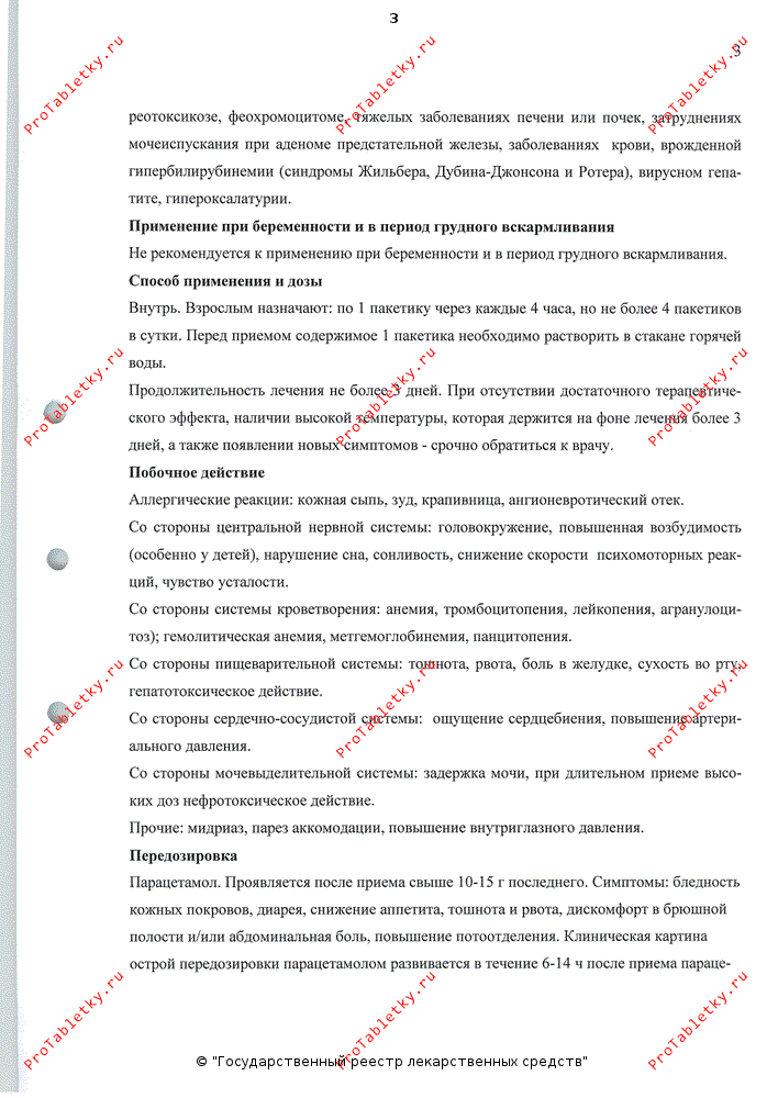 Учитывая наличие парацетамола: редко - нарушения со стороны системы кроветворения (анемия, тромбоцитопения, лейкопения, агранулоцитоз); при длительном приеме высоких доз возможны гепатотоксическое и нефротоксическое действие, гемолитическая анемия, метгемоглобинемия, панцитопения.