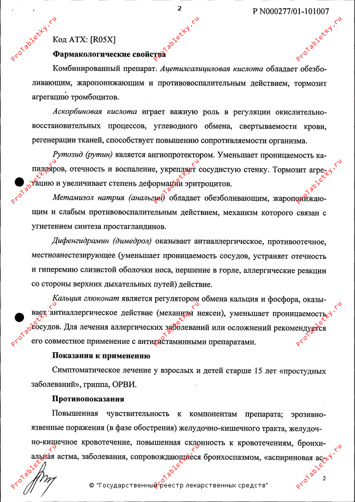 Препарат для снятия симптомов лихорадки, уменьшения интоксикации, головных и мышечных болей при острых респираторных вирусных инфекциях и гриппе. Эффект обусловлен комбинацией входящих состав противовоспалительных, жаропонижающих, противоаллергических компонентов. Достаточно выраженный эффект, хорошая продолжительность действия. Нельзя использовать у маленьких детей и детей школьного возраста до 15 лет. В состав входит анальгин (метамизол), который запрещен во многих европейских странах из-за угрозы развития агранулоцитоза. Подойдет для эпизодического применения и только начиная с 15-летнего возраста. Не следует злоупотреблять частым применением и увеличивать дозу препарата из-за возможных побочных эффектов. |