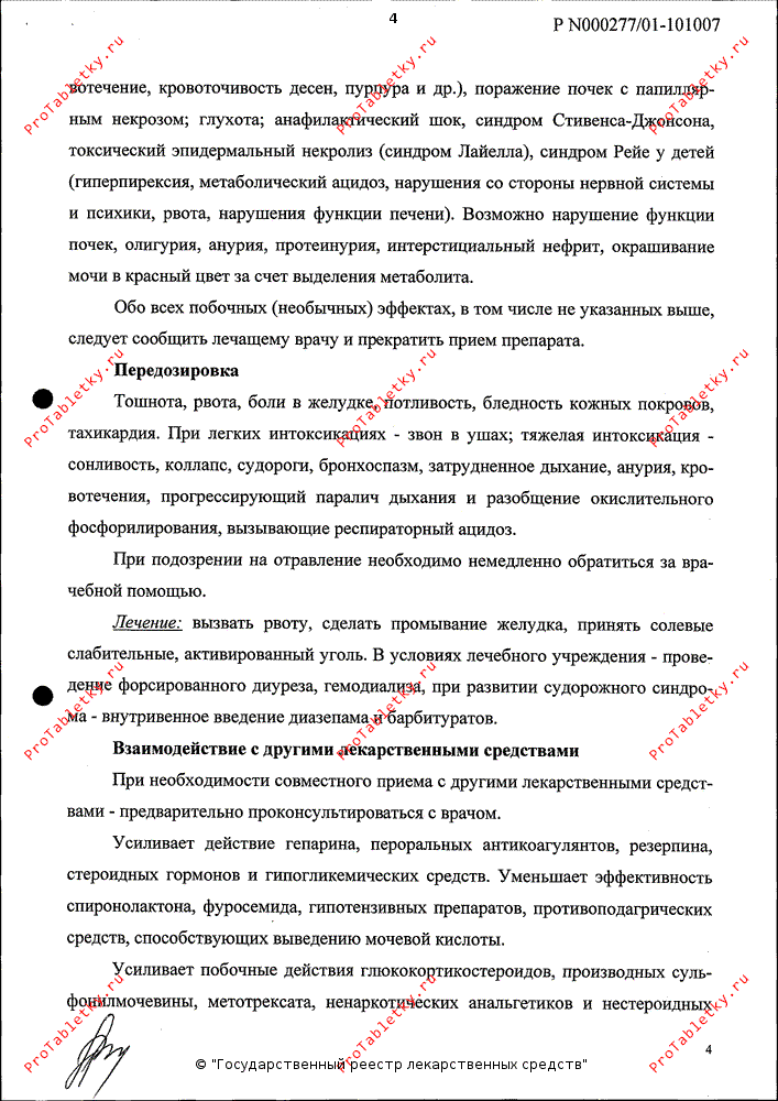 Симптомы: тошнота, рвота, боли в желудке, потливость, бледность кожных покровов, тахикардия; при незначительной передозировке - звон в ушах; при выраженной передозировке – сонливость, коллапс, судороги, бронхоспазм, затрудненное дыхание, анурия, кровотечения, прогрессирующий паралич дыхания и респираторный ацидоз (вследствие разобщения окислительного фосфорилирования).