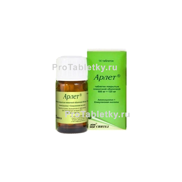 Препарат Арлет® содержит 2 действующих вещества: амоксициллин (полусинтетический пенициллин с широким спектром антибактериальной активности) и клавулановую кислоту (необратимый ингибитор β-лактамаз).