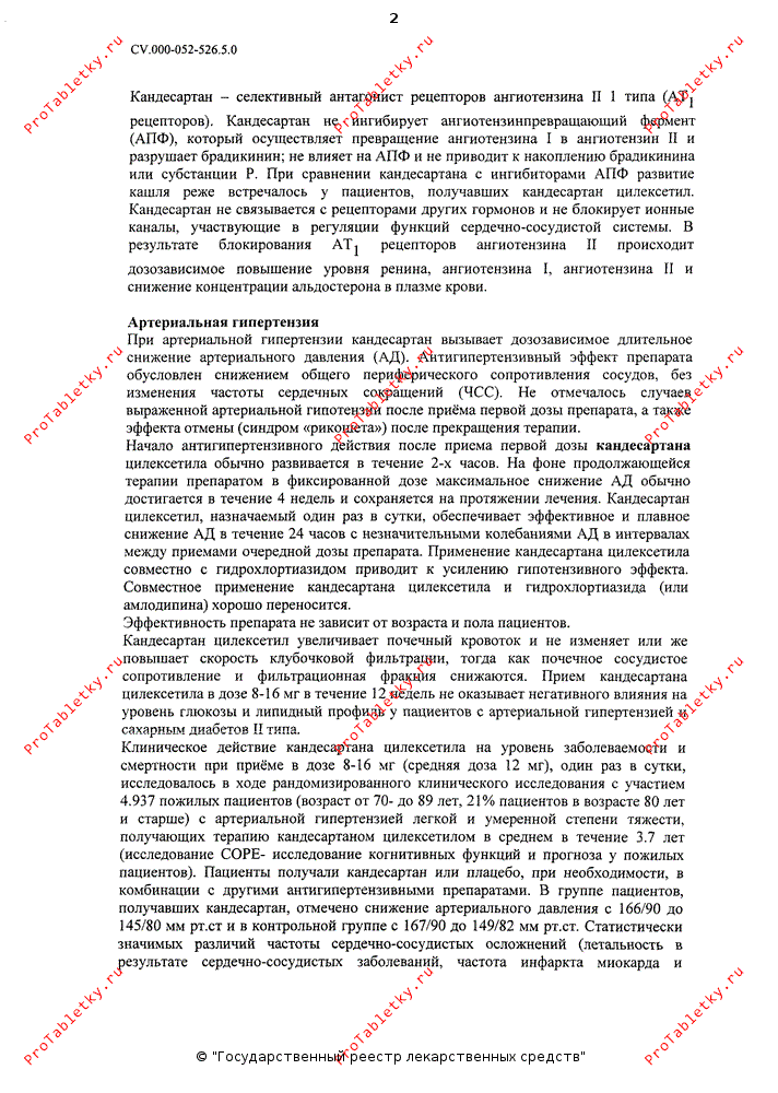 Начало гипотензивного действия после приема первой дозы кандесартана цилексетила обычно развивается в течение 2 ч. На фоне продолжающейся терапии препаратом в фиксированной дозе максимальное снижение АД обычно достигается в течение 4 недель и сохраняется на протяжении лечения. Кандесартана цилексетил, назначаемый 1 раз/сут, обеспечивает эффективное и плавное снижение АД в течение 24 ч с незначительными колебаниями АД в интервалах между приемами очередной дозы препарата. Применение кандесартана цилексетила совместно с гидрохлоротиазидом приводит к усилению гипотензивного эффекта. Совместное применение кандесартана цилексетила и гидрохлоротиазида (или амлодипина) хорошо переносится.