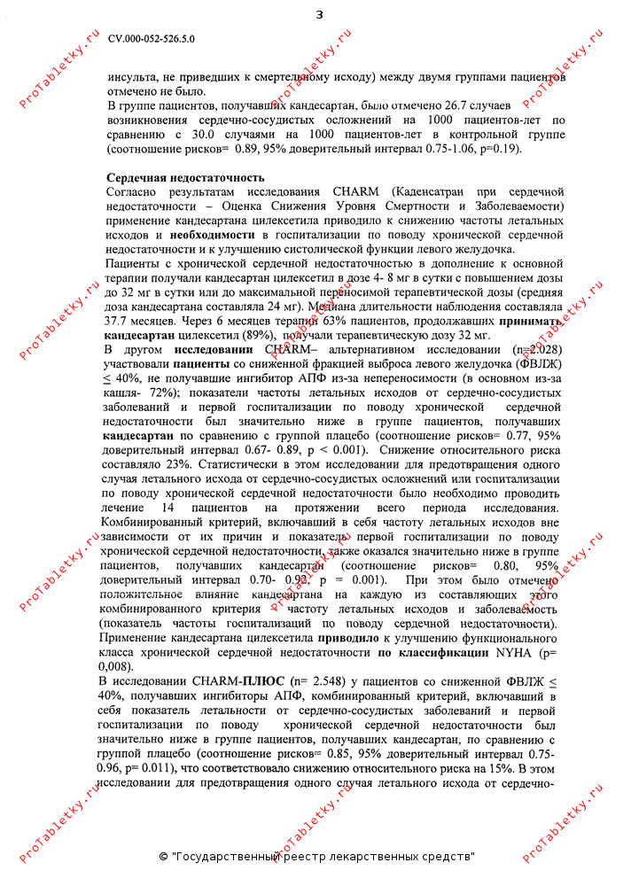 В группе пациентов, получавших кандесартан, было отмечено 26.7 случаев возникновения сердечно-сосудистых осложнений на 1000 пациенто-лет по сравнению с 30 случаями на 1000 пациенто-лет в контрольной группе (относительный риск = 0.89, 95% доверительный интервал 0.75-1.06, р=0.19).