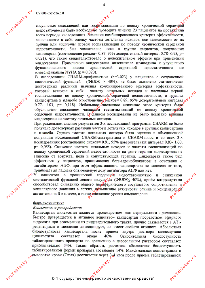 В другом исследовании CHARM-Alternative (n=2.028) участвовали пациенты со сниженной фракцией выброса левого желудочка (ФВЛЖ ≤ 40%), не получавшие ингибитор АПФ из-за непереносимости (в основном из-за кашля - 72%); показатели частоты летальных исходов от сердечно-сосудистых заболеваний и первой госпитализации по поводу хронической сердечной недостаточности были значительно ниже в группе пациентов, получавших кандесартан по сравнению с группой плацебо (соотношение рисков = 0.77, 95% доверительный интервал 0.67-0.89, р<0.001). Снижение относительного риска составляло 23%. Статистически в этом исследовании для предотвращения одного случая летального исхода oт сердечно-сосудистых осложнений или госпитализации по поводу хронической сердечной недостаточности было необходимо проводить лечение 14 пациентов на протяжении всего периода исследования. Комбинированный критерий, включавший в себя частоту летальных исходов вне зависимости от их причин и показатель первой госпитализации по поводу хронической сердечной недостаточности, также оказался значительно ниже в группе пациентов, получавших кандесартан (соотношение рисков = 0.80, 95% доверительный интервал 0.70-0.92, р = 0.001). При этом было отмечено положительное влияние кандесартана на каждую из составляющих этого комбинированного критерия - частоту летальных исходов и заболеваемость (показатель частоты госпитализаций по поводу сердечной недостаточности). Применение кандесартана цилексетила приводило к улучшению функционального класса хронической сердечной недостаточности по классификации NYHA (р = 0.008).