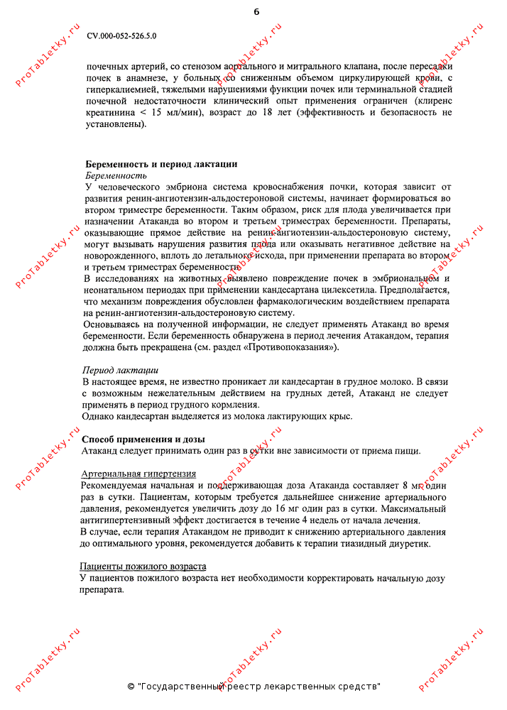 В настоящее время неизвестно, проникает ли кандесартан в грудное молоко. В связи с возможным нежелательным действием на грудных детей, Атаканд® не следует применять в период грудного вскармливания.