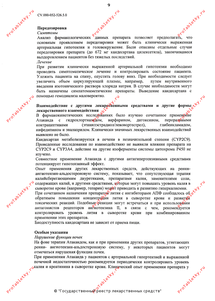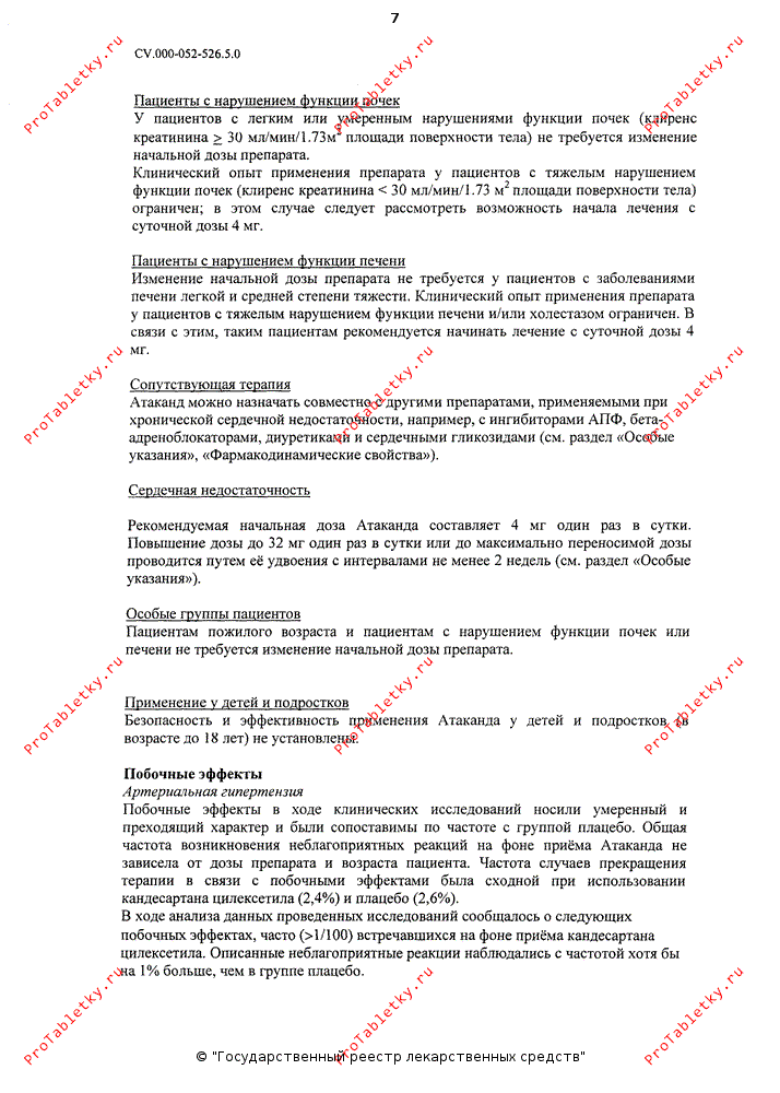 У пациентов с хронической сердечной недостаточностью на фоне терапии препаратом Атаканд® может развиться артериальная гипотензия. Как и при применении других препаратов, влияющих на РААС, причиной развития артериальной гипотензии у пациентов с артериальной гипертензией может быть уменьшение ОЦК, как наблюдается у пациентов, получающих высокие дозы диуретиков. Поэтому в начале терапии следует соблюдать осторожность и, при необходимости, проводить коррекцию гиповолемии.