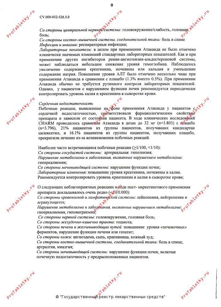 Побочные реакции, выявленные на фоне применения препарата Атаканд® у пациентов с сердечной недостаточностью, соответствовали фармакологическим свойствам препарата и зависели от состояния пациента. В ходе клинических исследований CHARM проводилось сравнение препарата Атаканд® в дозах до 32 мг (n=3803) с плацебо (n=3796), 21% пациентов из группы пациентов, получавших кандесартана цилексетил, и 16.1% пациентов из группы пациентов, получавших плацебо, прекратили лечение из-за возникновения побочных реакций.