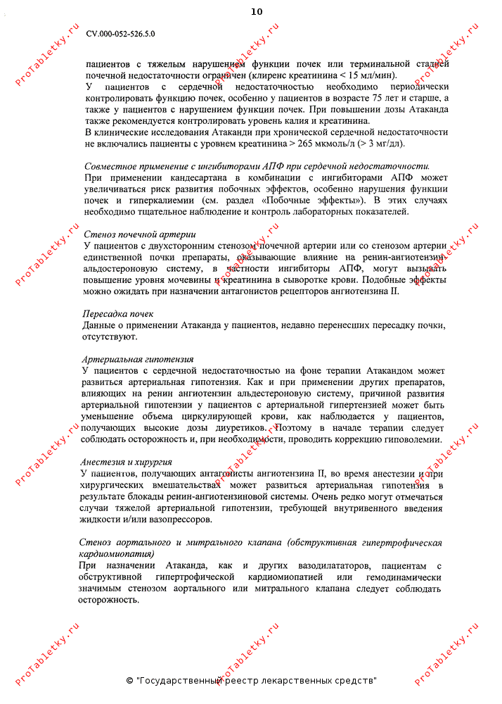 При назначении препарата Атаканд®, как и других вазодилататоров, пациентам с обструктивной гипертрофической кардиомиопатией или гемодинамически значимым стенозом аортального или митрального клапана следует соблюдать осторожность.
