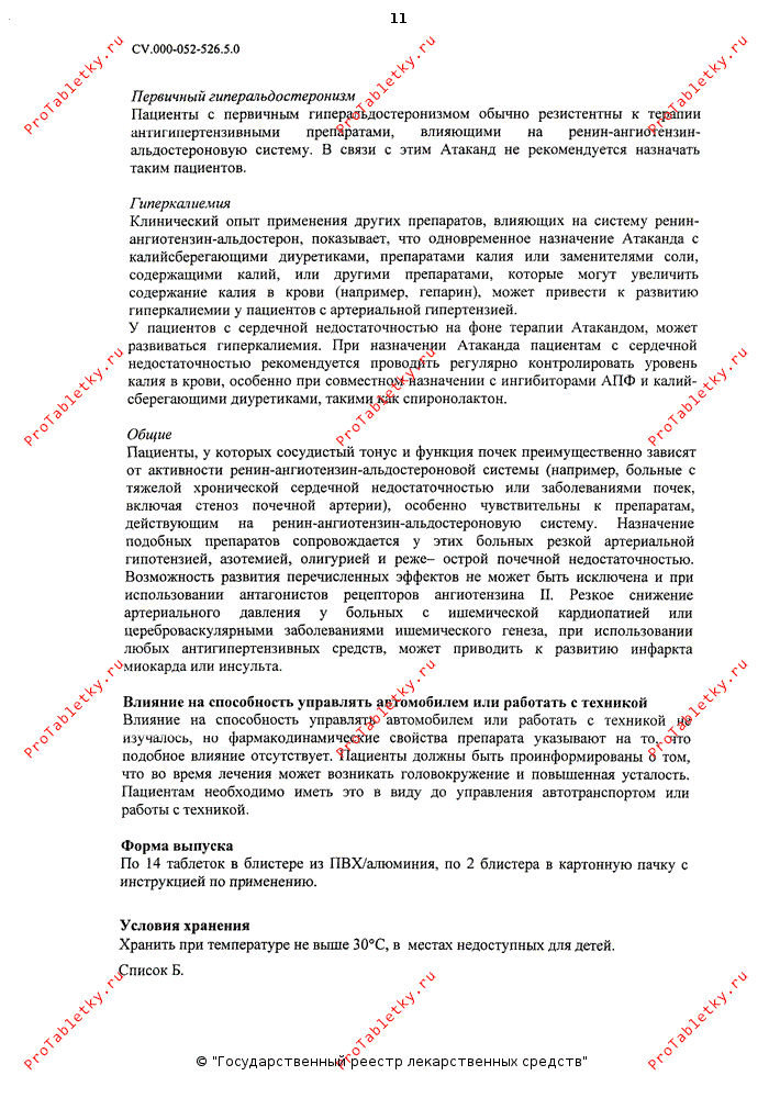 Пациенты с первичным гиперальдостеронизмом обычно резистентны к терапии антигипертензивными препаратами, влияющими на РААС. В связи с этим Атаканд® не рекомендуется назначать таким пациентам.