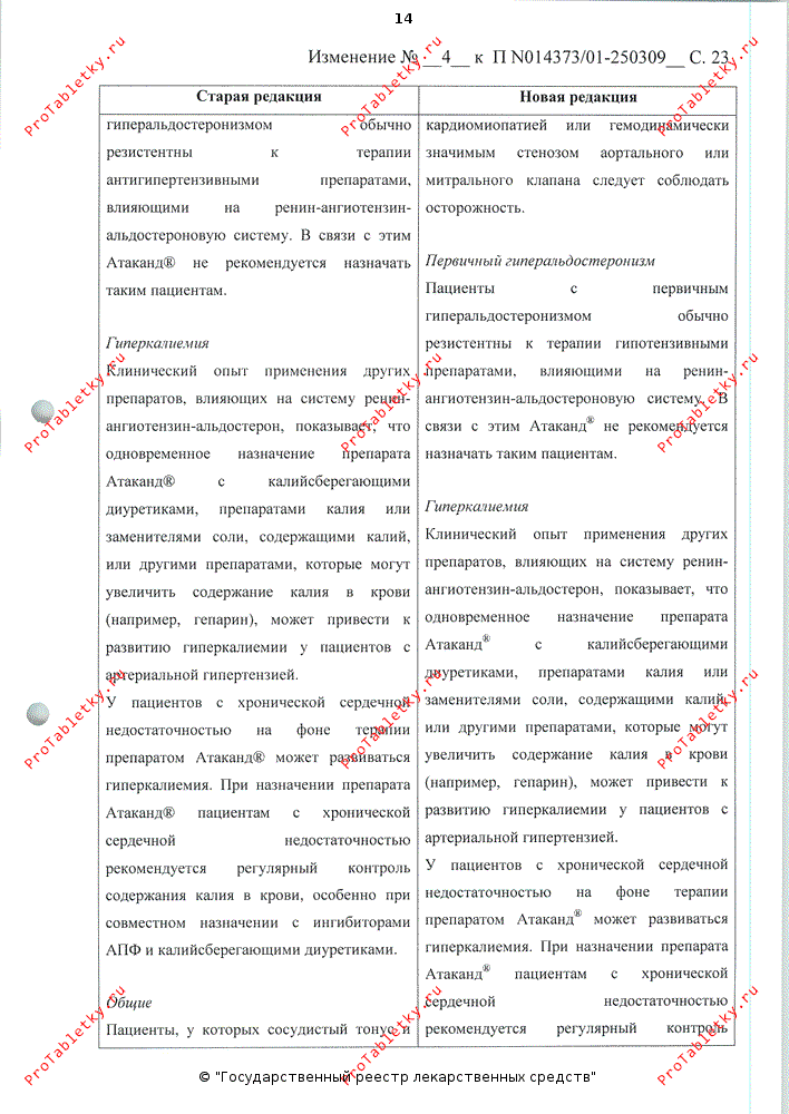 Клинический опыт применения других препаратов, влияющих на РААС, показывает, что одновременное назначение препарата Атаканд® с калийсберегающими диуретиками, препаратами калия или заменителями соли, содержащими калий, или другими препаратами, которые могут увеличить содержание калия в крови (например, гепарин), может привести к развитию гиперкалиемии у пациентов с артериальной гипертензией.