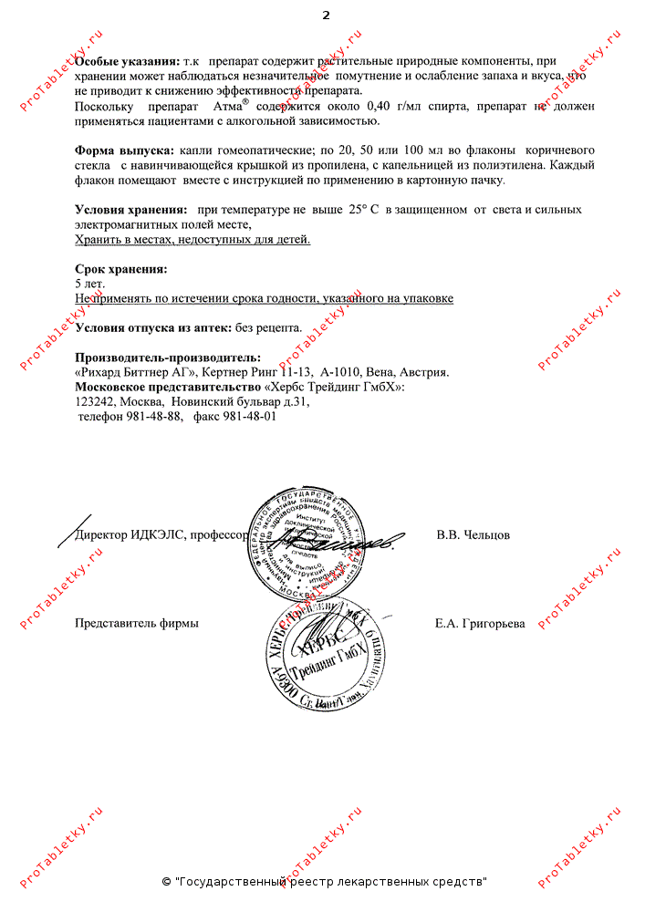 Атма позволяет купировать астенический синдром инфекционного и гипоксического генеза. Препарат стимулирует компенсаторные механизмы организма, повышает его устойчивость к воздействию внешних факторов и неспецифическую реактивность. Атму можно эффективно использовать при кашле инфекционной, аллергической и смешанной этиологии. Для получения оптимальных результатов фармакотерапии препарат рекомендуется принимать за полчаса до еды или через 1 час после нее. Атму можно принимать как в первозданно-чистом виде, так и вместе с водой или грудным молоком. Препарат назначают трижды в сутки: по 10 капель (взрослым и детям старше 12 лет), по 2-7 капель (детям от 1 до 12 лет), по 1 капле (детям на первом году жизни). В начальной фазе заболевания или в случаях его обострения, требующих быстрого купирования симптоматики, возможен прием атмы каждые полчаса-час по 8-10 капель до достижения явного улучшения состояния пациента, но не более 8 раз в день. После нормализации состояния возвращаются к прежнему режиму приема препарата. Длительность лечения атмой составляет в среднем 2-4 недели (при остром бронхите), 1 месяц (при хроническом необструктивном бронхите), 3 месяца (при бронхиальной астме и хроническом обструктивном бронхите), 2-3 месяца (при кашле курильщика). Профилактический медикаментозный курс может длиться от 2 недель до 2 месяцев. Кратность его проведения - 2-3 раза в год. Поскольку атма содержит натуральные растительные компоненты, при длительном хранении может наблюдаться небольшое помутнение и ослабление ее органолептических свойств, что не влияет на фармакологическую эффективность. Учитывая, что препарат содержит некоторое количество этилового спирта, он не должен использоваться у лиц, страдающих алкогольной зависимостью. Клинически значимых случаев взаимодействия атмы с другими препаратами до настоящего времени не отмечалось.