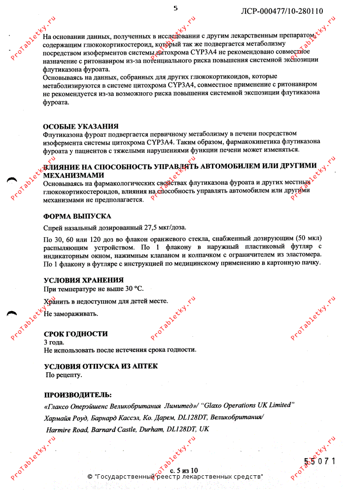Основываясь на фармакологических свойствах флутиказона фуроата и других ГКС для местного применения, влияние на способность к управлению автотранспортом или другими механизмами не предполагается.