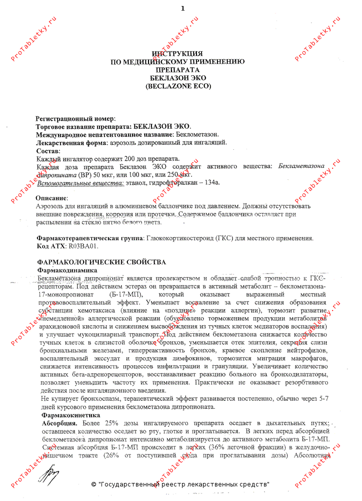 Часть дозы, которая ненамеренно проглатывается, в значительной степени инактивируется при "первом прохождении" через печень. В печени происходит процесс превращения беклометазона дипропионата в беклометазон монопропионат и затем – в полярные метаболиты.
