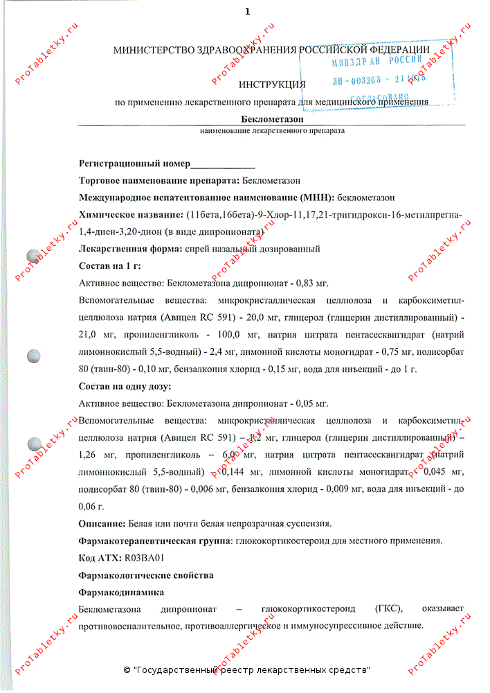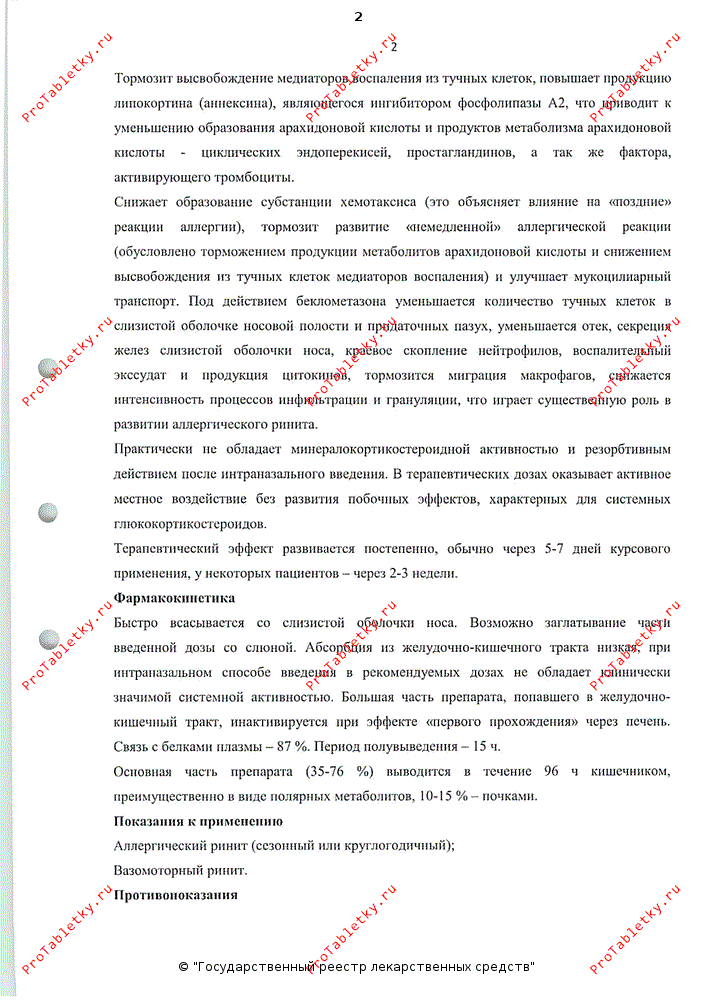 Снижает количество мастоцитов в слизистой нижних отделов респираторного тракта, устраняет отечность эпителиальной ткани, подавляет секреторную активность желез бронхов. Снижает тонус гладких мышц бронхов, делая их менее чувствительным к воздействию провоцирующих факторов. Минералокортикоидной активностью (способностью задерживать в организме натрий и способствовать элиминации калия и кальция) не обладает. При использовании в указанных в инструкции по применению дозах побочных эффектов, свойственных системным глюкокортикостероидам, не вызывает. При введении в носовые ходы снимает отечность слизистой и уменьшает ее кровенаполнение. Лечебное действие лекарственного средства развивается, как правило, спустя 5-7 дней регулярного применения. В педиатрической практике используется, начиная с 12-летнего возраста. Не предназначен для снятия острых и/или тяжелых приступов бронхиальной астмы, требующих неотложного терапевтического вмешательства. У пациентов с недостаточностью функции надпочечников препарат применяют с особой осторожностью. Перевод пациентов, постоянно принимающих таблетированные глюкокортикостероиды, на ингаляционный способ введения можно осуществлять только при стабилизации клинической картины. При развитии в ротовой полости и верхних отделах респираторного тракта молочницы показана местная антимикотическая терапия без отмены приема бекламетазона.
