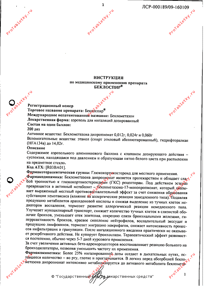 Более 25% ингалированной дозы оседает в дыхательных путях, оставшееся количество – во рту, глотке и проглатывается. В легких перед абсорбцией беклометазона дипропионат интенсивно метаболизируется до активного метаболита беклометазона-17-монопропионат. Его системная абсорбция происходит в легких (36%-легочная фракция), в ЖКТ (26% от поступившей при проглатывании дозы). Абсолютная биодоступность неизмененного беклометазона дипропионата и беклометазона-17-монопропионат составляет, соответственно, около 2% и 62% от ингалированной дозы. Беклометазона дипропионат всасывается быстро (Tmax - 0.3 ч), беклометазона-17-монопропионат – медленнее (Tmax - 1 ч).