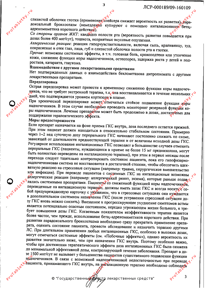 Пациенты со сниженной функцией коры надпочечников, переведенные на ингаляционную терапию, должны иметь запас ГКС и всегда носить с собой предупреждающую карточку с указанием, что в стрессовых ситуациях они нуждаются в дополнительном системном назначении ГКС (после устранения стрессовой ситуации дозу ГКС вновь можно снизить). Внезапное и прогрессирующее ухудшение симптомов астмы является потенциально опасным состоянием, нередко угрожающим жизни больного, и требует повышения дозы ГКС. Косвенным показателем неэффективности терапии является более частое, чем прежде, использование бета2-адреномиметиков короткого действия. При развитии парадоксального бронхоспазма необходимо сразу прекратить применение препарата, оценить состояние пациента, провести обследование и назначить терапию другими лекарственными средствами. При длительном применении любых ингаляционных ГКС, особенно в высоких дозах, могут отмечаться системные эффекты, однако вероятность их развития значительно ниже, чем при назначении ГКС внутрь. Поэтому особенно важно, чтобы при достижении терапевтического эффекта доза ингаляционных ГКС была снижена до минимальной эффективной дозы, контролирующей течение заболевания.