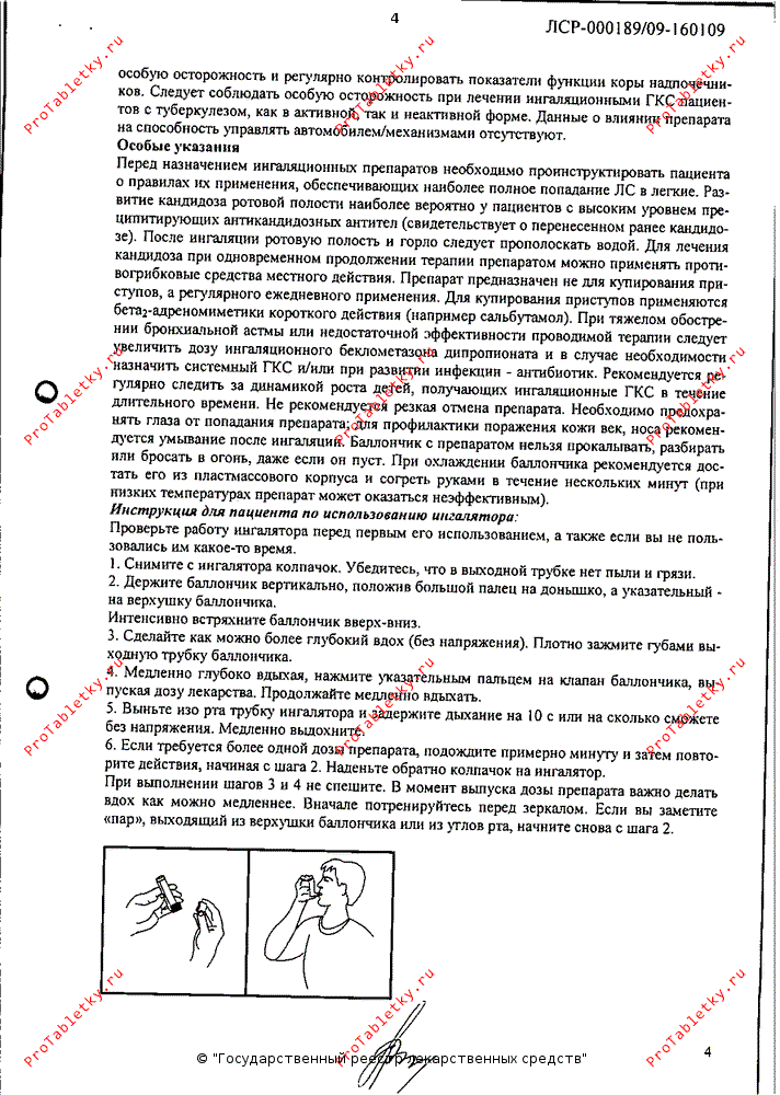 Перед назначением ингаляционных препаратов необходимо проинструктировать пациента о правилах их применения, обеспечивающих наиболее полное попадание лекарственного средства в легкие. Развитие кандидоза ротовой полости наиболее вероятно у пациентов с высоким уровнем преципитирующих антикандидозных антител (свидетельствует о перенесенном ранее кандидозе). После ингаляции ротовую полость и горло следует прополоскать водой. Для лечения кандидоза при одновременном продолжении терапии препаратом можно применять противогрибковые средства местного действия.