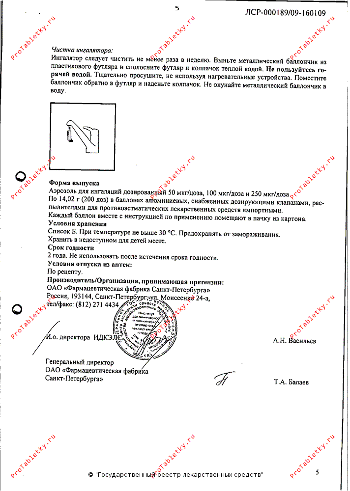 Баллончик с препаратом нельзя прокалывать, разбирать или бросать в огонь, даже если он пуст. При охлаждении баллончика рекомендуется достать его из пластмассового корпуса и согреть руками в течение нескольких минут (при низких температурах препарат может оказаться неэффективным).