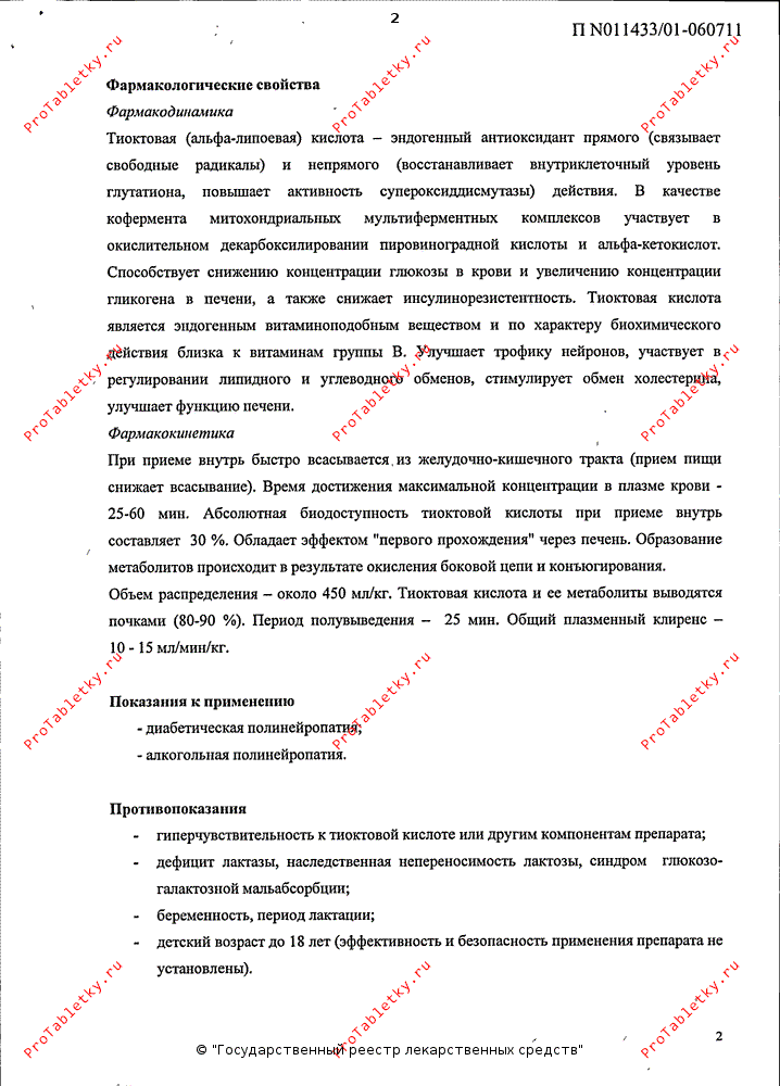 Лечение: При подозрении на интоксикацию тиоктовой кислотой (например, введение более 80 мг тиоктовой кислоты на 1 кг массы тела) рекомендуется экстренная госпитализация и немедленное применение мер в соответствии с общими принципами, принятыми при случайном отравлении. Терапия симптоматическая. Лечение генерализованных судорог, лактоацидоза и других угрожающих жизни последствий интоксикации должно проводиться в соответствии с принципами современной интенсивной терапии. Специфического антидота нет. Гемодиализ, гемоперфузия или методы фильтрации с принудительным выведением тиоктовой кислоты не эффективны.