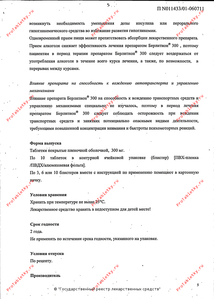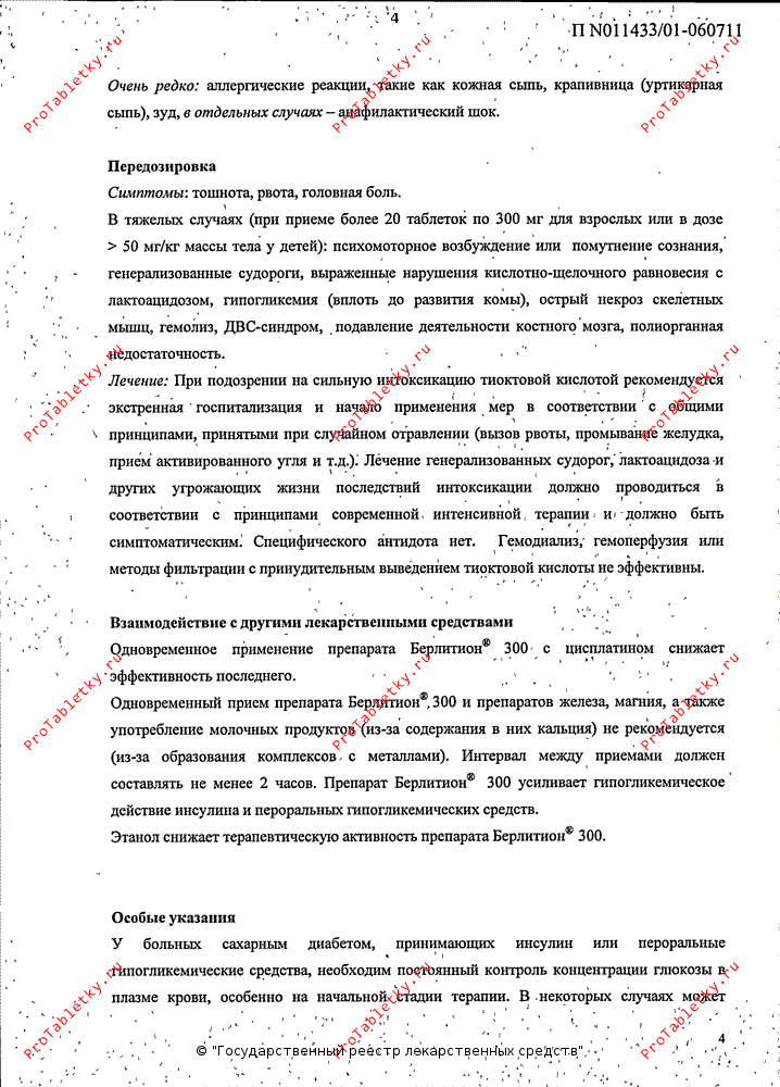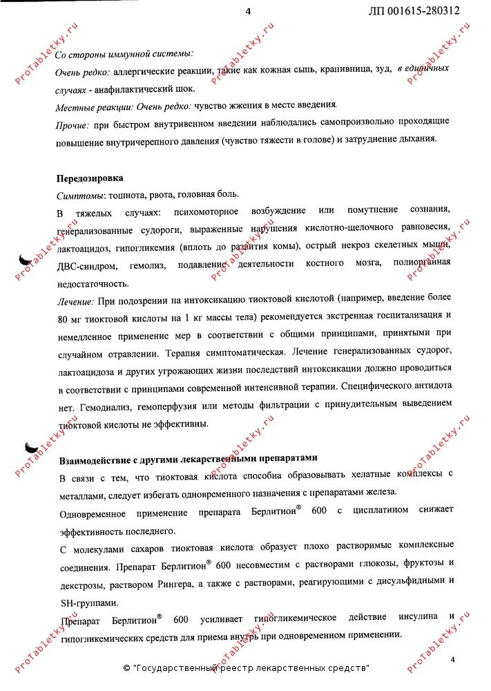Побочные действия при использовании Берлитиона 600 замечены не были. На практике отмечается улучшение при диабетической полинейропатии, что относится только к инъекциям препарата, но эффект сохраняется не продолжительное время (что скорее минус). Пероральная форма препарата неэффективна. Цена высокая. Берлитион 600 (тиоктовая кислота) это вещество, которое в остальном мире зарегистрировано, как БАД, и у которого нет достоверных РКИ показавших его пользу. У нас в стране широко используется в практике, но не приносит должного эффекта. Не рекомендую. | |||||||||