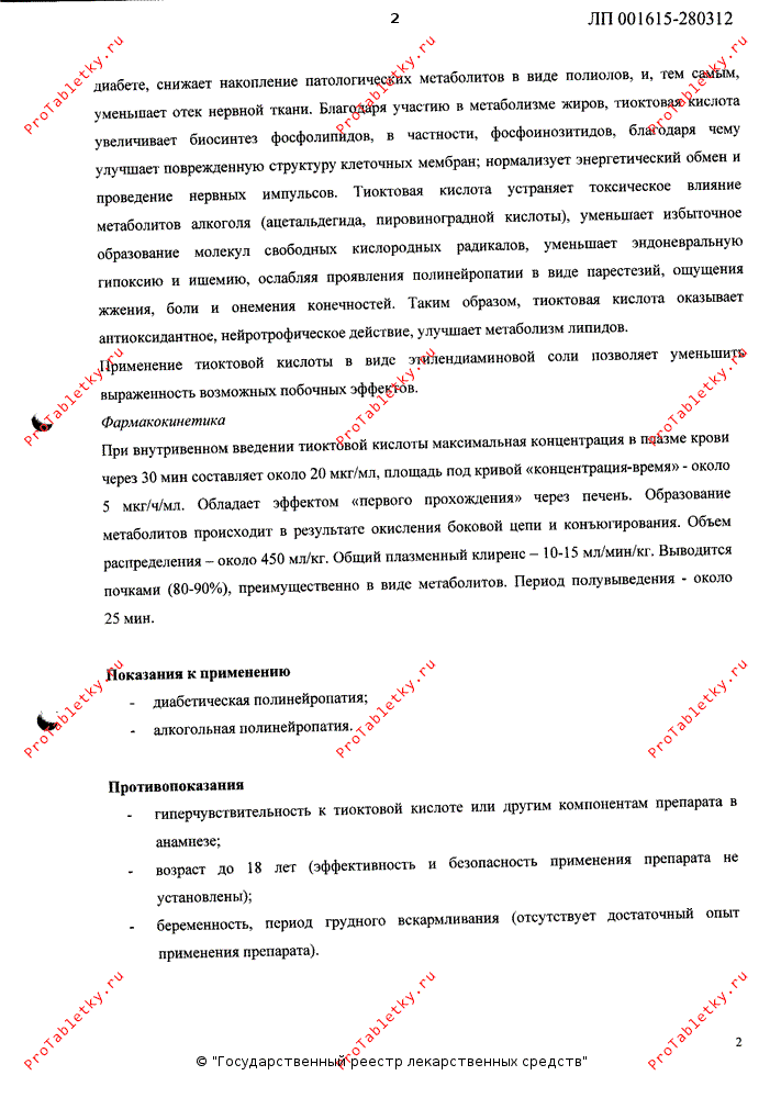 Препарат тиоктовой кислоты, применяется пациентам, у кого диабетическая полинейропатия, получается хороший терапевтический эффект. Назначаем по 600 мг раствора на 200.0 0.9% NaCl внутривенно капельно в течение 10 дней, затем внутрь в течение 1 месяца по 300 мг 2 раза за 30 минут до еды. Препарат применяется в комплексе с сосудистыми, витаминными, нейротропными препаратами. | |||||||||