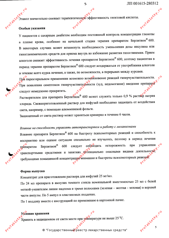 У пациентов с сахарным диабетом необходим постоянный контроль концентрации глюкозы в плазме крови, особенно на начальной стадии терапии препаратом Берлитион 600. В некоторых случаях может возникнуть необходимость уменьшения дозы инсулина или гипогликемических средств для приема внутрь во избежание развития гипогликемии. Прием алкоголя снижает эффективность лечения препаратом Берлитион 600, поэтому пациентам в период терапии препаратом Берлитион 600 следует воздержаться от употребления алкоголя в течение всего курса лечения, а также, по возможности, в перерывах между курсами.