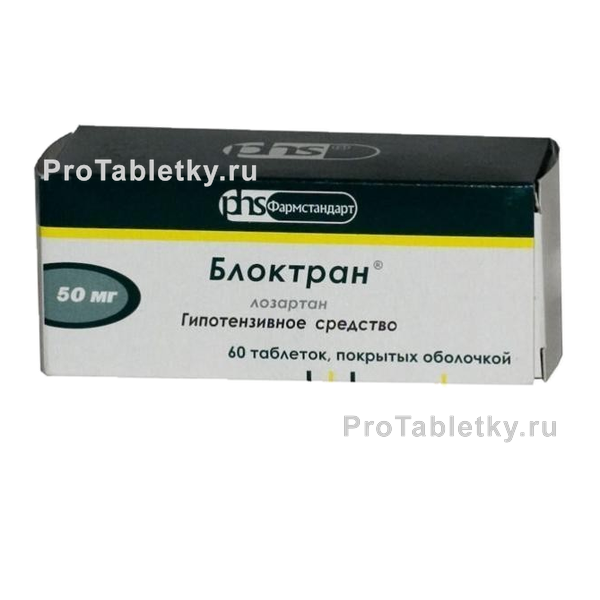 Блоктран (лозартан) – антигипертензивное лекарственное средство, блокирующее рецепторы ангиотензина II. Ангиотензин II – эндогенное биологически активное вещество, обладающее ярко выраженным сосудосуживающим эффектом и являющееся ключевым элементом патофизиологического паттерна артериальной гипертензии. Связываясь с рецепторами типа AT1, ангиотензин II запускает ряд важнейших биологических реакций, включая уменьшение просвета кровеносных сосудов и выброс альдостерона. В дополнение к этому, ангиотензин II активизирует пролиферацию клеток гладких мышц. Блоктран выступает в роли избирательного антагониста по отношению к рецепторам AT1. Действующее вещество препарата и его активный метаболит блокируют взаимодействие ангиотензина II с данными рецепторами, препятствуя развитию всех его физиологических эффектов. С другими рецепторами, участвующими в управлении работой сердечно-сосудистой системы, препарат не взаимодействует и не подавляет активность ангиотензинпревращающего фермента. Препарат препятствует повышению верхнего и нижнего артериального давления. Во время достижения пиковой концентрации активного компонента гипертензивный эффект ангиотензина II угнетается на 85%, а спустя сутки – на 30-35%. Уровень действующего вещества и его фармакологически активного метаболического производного, равно как и выраженность гипотензивного действия лекарственного средства, возрастают пропорционально повышению дозы. В развитии гипотензивного эффекта участвует как сам активный компонент (лозартан), так и его метаболическое производное. Блоктран усиливает элиминацию из организма ионов натрия и мочевой кислоты. У лиц с гипертонией и усиленным выведением с мочой белков (главным образом альбумина), не страдающих сахарным диабетом, препарат уменьшает протеинурию. У женщин с артериальной гипертензией в постклимактерическом периоде Блоктран не оказывает влияние на содержание простагландинов в почках и системном кровотоке.