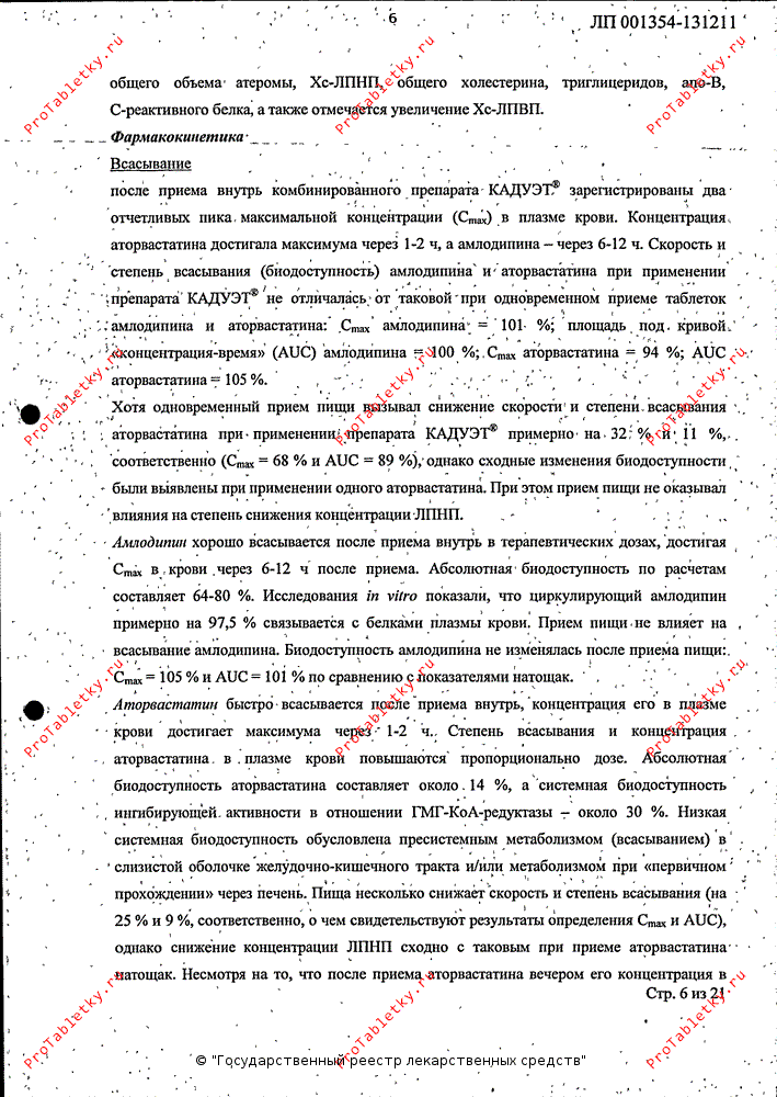 После приема внутрь комбинированного препарата Кадуэт зарегистрированы два отчетливых пика Cmax в плазме. Cmax аторвастатина достигалась через 1-2 ч, Cmax амлодипина - через 6-12 ч. Скорость и степень всасывания (биодоступность) амлодипина и аторвастатина при применении препарата Кадуэт не отличалась от таковой при одновременном приеме таблеток амлодипина и аторвастатина: Cmax амлодипина = 101%, AUC амлодипина = 100%, Cmax аторвастатина = 94%, AUC аторвастатина = 105%.