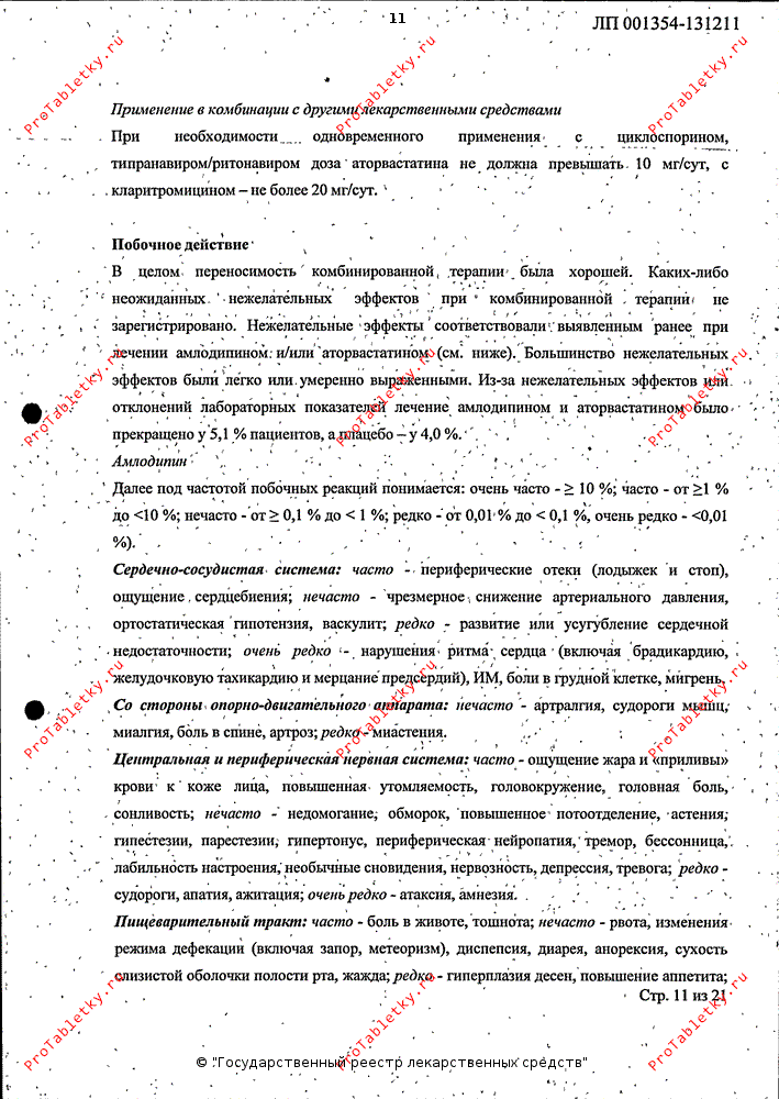 Нежелательные эффекты соответствовали выявленным ранее при лечении амлодипином и/или аторвастатином. В целом переносимость комбинированной терапии была хорошей. Большинство нежелательных эффектов были легко или умеренно выраженными. В контролируемых клинических исследованиях из-за нежелательных эффектов или отклонений лабораторных показателей лечение амлодипином и аторвастатином было прекращено у 5.1% пациентов, а плацебо - у 4.0%.