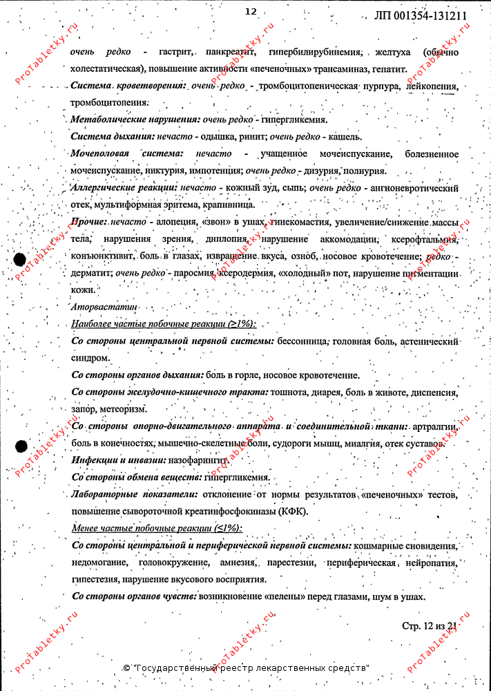 Не все перечисленные эффекты имели установленную причинную связь с терапией аторвастатином.