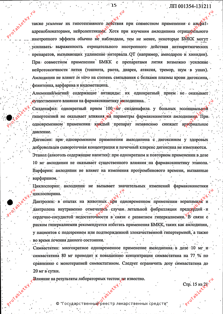 Амлодипин не влияет на изменения протромбинового времени, вызванные варфарином.
