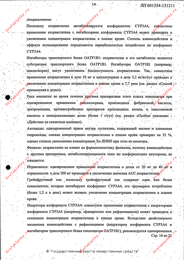 Риск миопатии при лечении другими препаратами этого класса возрастает при одновременном применении циклоспорина, производных фиброевой кислоты, эритромицина, никотиновой кислоты или азольных противогрибковых препаратов. Многие из этих препаратов ингибируют метаболизм, опосредованный CYP3А4, и/или транспорт лекарственных средств. Известно, что CYP3А4 - основной изофермент печени, участвующий в биотрансформации аторвастатина. Назначая аторвастатин в гиполипидемических дозах в сочетании с производными фиброевой кислоты, эритромицином, иммунодепрессантами, азольными противогрибковыми препаратами или никотиновой кислотой, следует тщательно взвесить ожидаемую пользу и риск лечения и регулярно наблюдать пациентов с целью выявления болей или слабости в мышцах, особенно в течение первых месяцев лечения и в период повышения дозы любого препарата. В подобных ситуациях можно рекомендовать периодическое определение активности КФК, хотя такой контроль не позволяет предотвратить развитие тяжелой миопатии.