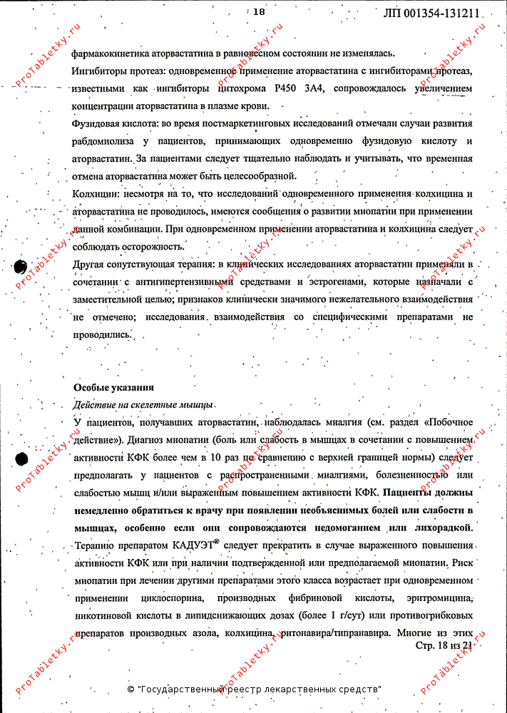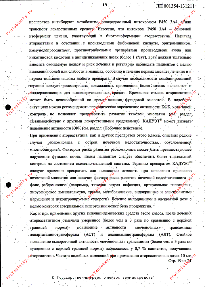 Прием Кадуэта может вызвать повышение активности КФК. При применении аторвастатина, как и других препаратов этого класса, описаны редкие случаи рабдомиолиза с острой почечной недостаточностью, обусловленной миоглобинурией. Терапию препаратом Кадуэт следует временно прекратить или полностью отменить при появлении признаков возможной миопатии или наличии фактора риска развития почечной недостаточности на фоне рабдомиолиза (например, тяжелая острая инфекция, артериальная гипотензия, оперативное вмешательство, травма, метаболические, эндокринные и электролитные нарушения и неконтролируемые судороги). Лечение амлодипином в адекватной дозе с целью контроля артериальной гипертензии может быть продолжено.