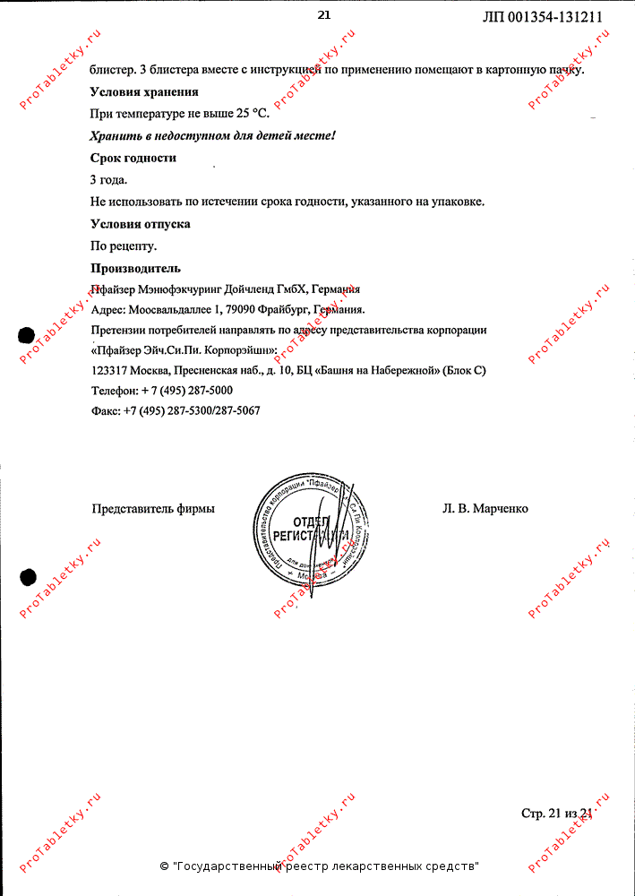 Таблетки, покрытые пленочной оболочкой белого цвета, овальные, на одной стороне нанесено "Pfizer", на другой - "CDT" и "051".