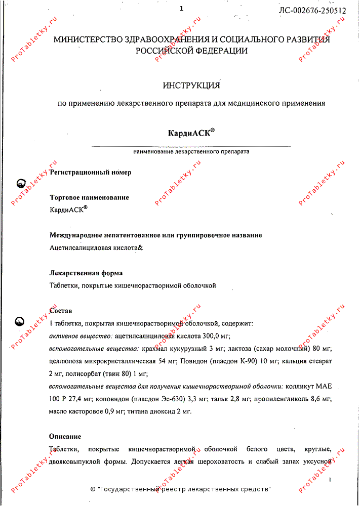 "КардиАСК" - неплохой препарат, рекомендую в дозе 100 мг 1 раз в сутки, длительность терапии назначается индивидуально. Побочных эффектов не наблюдала, переносится неплохо пациентами. Перед оперативными вмешательствами препарат отменяется за 5 дней. Перед применением необходимо проконсультироваться с врачом, имеются противопоказания в виде обострений язвенной болезни желудка, лДПК. | |||||||||