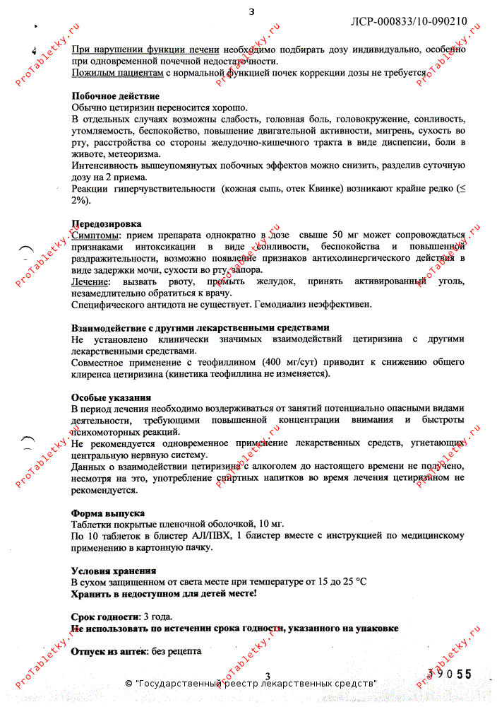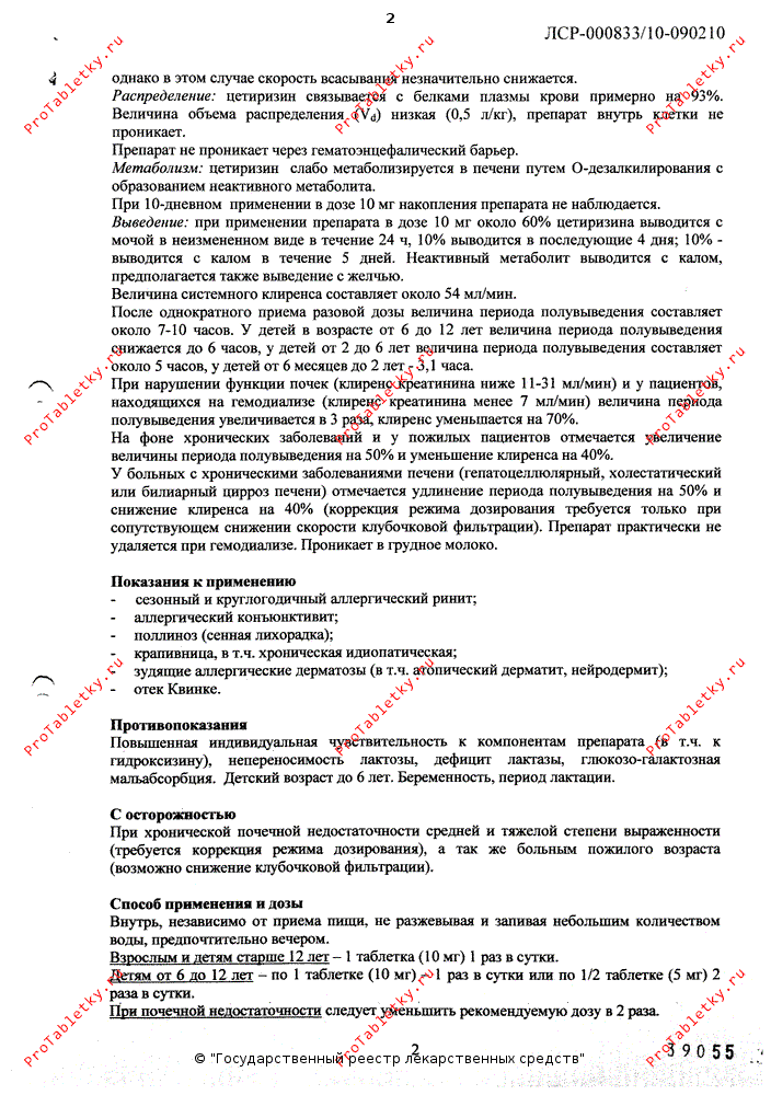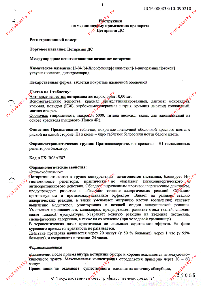Быстро всасывается из ЖКТ, Cmax после приема внутрь достигается через 1 ч. Биодоступность цетиризина при приеме в виде таблеток и сиропа одинакова. Пища не влияет на полноту всасывания (AUC), но удлиняет на 1 ч время достижения Cmax и снижает величину Cmax на 23%. При приеме в дозе 10 мг 1 раз/сут в течение 10 сут Css в плазме составляет 310 нг/мл и отмечается через 0.5-1.5 ч после приема. Связывание с белками плазмы - 93% и не меняется при концентрации цетиризина в диапазоне 25-1000 нг/мл. Фармакокинетические параметры цетиризина меняются линейно при назначении его в дозе 5-60 мг. Vd - 0.5 л/кг. В небольших количествах метаболизируется в печени путем О-деалкилирования с образованием фармакологически неактивного метаболита (в отличие от других антагонистов Н1-гистаминовых рецепторов, которые метаболизируются в печени с помощью системы цитохромов). Не кумулирует. 2/3 дозы выводится в неизмененном виде почками и около 10% - с калом. Системный клиренс - 53 мл/мин. T1/2 у взрослых - 7-10 ч, у детей в возрасте от 6 до 12 лет - 6 ч, от 2 до 6 лет - 5 ч, от 6 мес до 2 лет - 3.1 ч. У пациентов пожилого возраста T1/2 увеличивается на 50%, а системный клиренс снижается на 40% (снижение функции почек). У больных с нарушением функции почек (КК<40 мл/мин) клиренс препарата уменьшается, а T1/2 удлиняется (так, у больных, находящихся на гемодиализе, общий клиренс снижается на 70% и составляет 0.3 мл/мин/кг, а T1/2 удлиняется в 3 раза), что требует соответствующего изменения режима дозирования. Практически не удаляется в ходе гемодиализа. У больных с хроническими заболеваниями печени (гепатоцеллюлярный, холестатический или билиарный цирроз печени) отмечается удлинение T1/2 на 50% и снижение общего клиренса на 40% (коррекция режима дозирования требуется только при сопутствующем снижении скорости клубочковой фильтрации). Проникает в грудное молоко.Форма выпуска