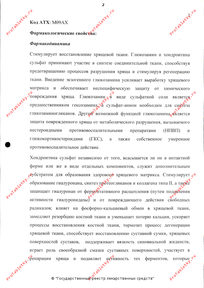 Стимулирует восстановление хрящевой ткани. Глюкозамин и хондроитина сульфат принимают участие в синтезе соединительной ткани, способствуя предотвращению процессов разрушения хряща и стимулируя регенерацию ткани. Введение экзогенного глюкозамина усиливает выработку хрящевого матрикса и обеспечивает неспецифическую защиту от химического повреждения хряща. Глюкозамин в виде сульфатной соли является предшественником гексозамина, а сульфат-анион необходим для синтеза гликозаминогликанов. Другой возможной функцией глюкозамина является защита поврежденного хряща от метаболического разрушения, вызываемого нестероидными противовоспалительными препаратами (НПВП) и глюкокортикостероидами (ГКС), а также собственное умеренное противовоспалительное действие.