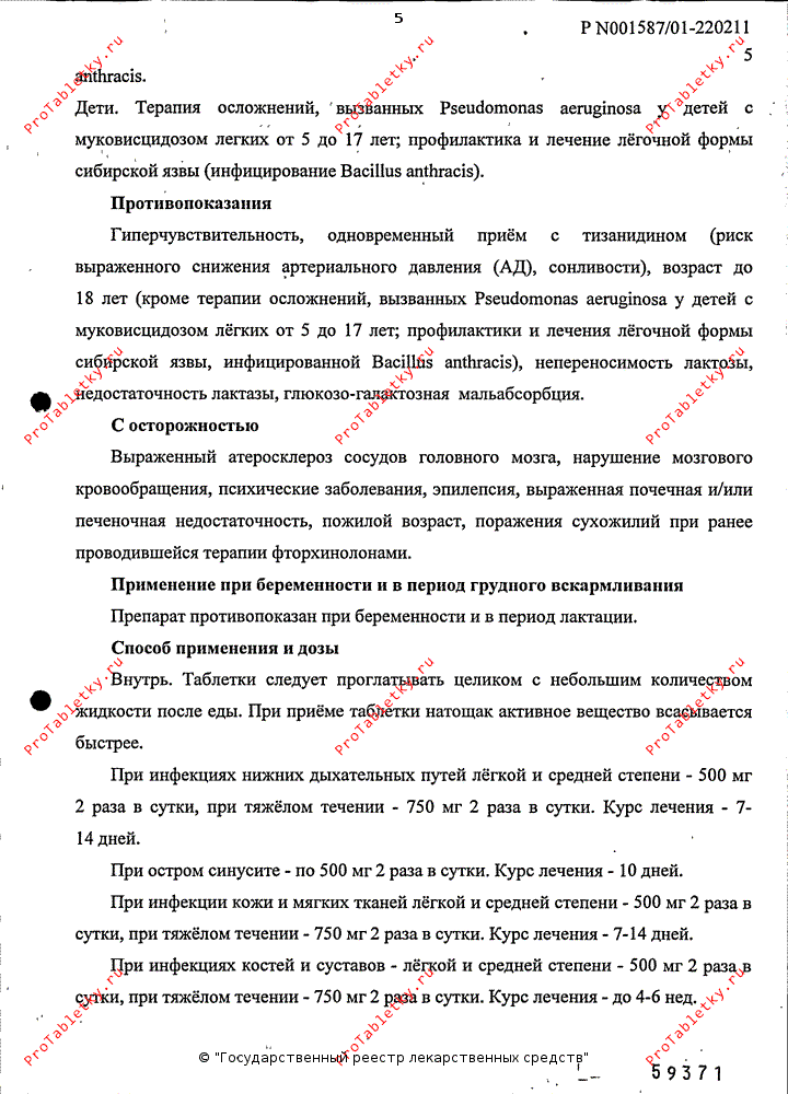 Рекомендуемая разовая доза для таблеток составляет 250 мг для несложных и 500 мг для сложных инфекций при ежедневном двукратном приеме. Препарат принимается на голодный желудок вместе с обильным количеством жидкости. Средний курс лечения ципрофлоксацином составляет от 7 до 10 дней. При тяжело протекающих инфекциях препарат может быть использован в виде внутривенных инфузий по 400 мг дважды в сутки (подробный список доз антибиотика в зависимости от заболевания приведен в листке-вкладыше). В офтальмологической и ЛОР-практике ципрофлоксацин используется местно в виде глазных и ушных капель. При легких и умеренных глазных инфекциях достаточно закапывать по 2 капли препарата в конъюнктивальный мешок каждые 4 часа, при тяжелых - каждый час. Глазная мазь, как лекарственная форма ципрофлоксацина, в настоящее время не имеет широкого распространения и выпускается лишь одним заводом - российским ОАО "Татхимфармпрепараты". В отоларингологии рекомендуемой дозой ципрофлоксацина являются 3-4 капли, закапываемые в наружный слуховой проход 2-4 раза в день.