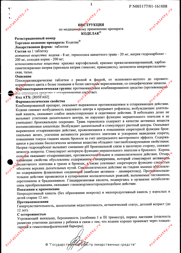 Таким образом, коделак обеспечивает удаление слизи из самых глухих «закоулков» бронхиального дерева при кашле и угнетает кашлевой рефлекс. Пик активности препарата — 30-60 минут с момента приема, при этом его действие сохраняется еще на протяжении 2-6 часов. Коделак следует принимать по 1 табл. 2-3 раза в день. Максимальная суточная доза рассчитывается с оглядкой на наиболее сильнодействующий компонент препарата — кодеина: его суточная доза не должна превышать 0,2 г, разовая — 0,05 г (для справки: в одной таблетке коделака содержится 0,008 г кодеина).