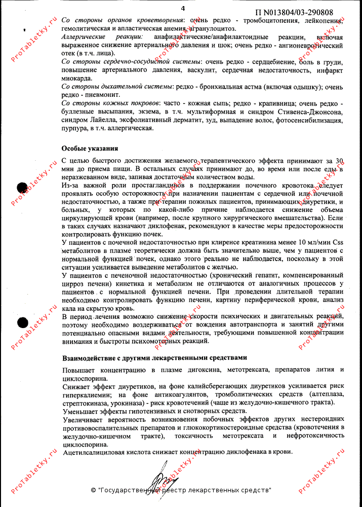 Хотя в клинических исследованиях не установлено влияния диклофенака на действие антикоагулянтов, описаны отдельные случаи возникновения кровотечений при одновременном применении диклофенака и варфарина.